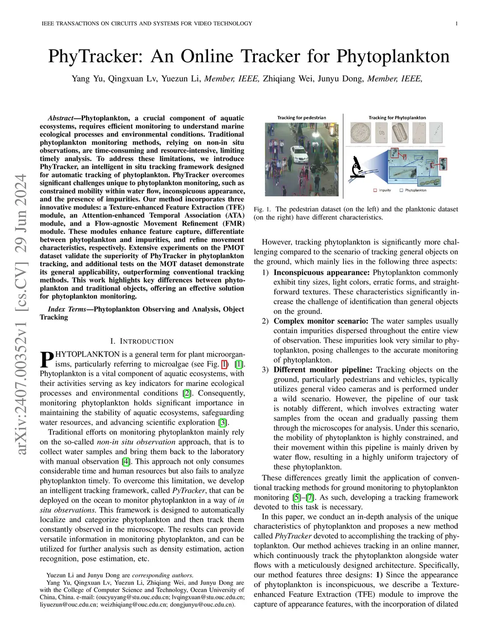 Phytoplankton, a crucial component of aquatic ecosystems, requires efficient monitoring to understand marine ecological processes and environmental conditions. Traditional phytoplankton monitoring methods, relying on non-in situ observations, are time-consuming and resource-intensive, limiting timely analysis. To address these limitations, we introduce PhyTracker, an intelligent in situ tracking framework designed for automatic tracking of phytoplankton. PhyTracker overcomes significant challenges unique to phytoplankton monitoring, such as constrained mobility within water flow, inconspicuous appearance, and the presence of impurities. Our method incorporates three innovative modules: a Texture-enhanced Feature Extraction (TFE) module, an Attention-enhanced Temporal Association (ATA) module, and a Flow-agnostic Movement Refinement (FMR) module. These modules enhance feature capture, differentiate between phytoplankton and impurities, and refine movement characteristics, respectively. Extensive experiments on the PMOT dataset validate the superiority of PhyTracker in phytoplankton tracking, and additional tests on the MOT dataset demonstrate its general applicability, outperforming conventional tracking methods. This work highlights key differences between phytoplankton and traditional objects, offering an effective solution for phytoplankton monitoring.