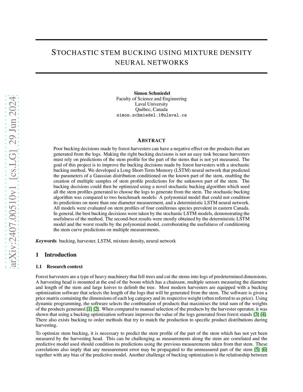 Poor bucking decisions made by forest harvesters can have a negative effect on the products that are generated from the logs. Making the right bucking decisions is not an easy task because harvesters must rely on predictions of the stem profile for the part of the stems that is not yet measured. The goal of this project is to improve the bucking decisions made by forest harvesters with a stochastic bucking method. We developed a Long Short-Term Memory (LSTM) neural network that predicted the parameters of a Gaussian distribution conditioned on the known part of the stem, enabling the creation of multiple samples of stem profile predictions for the unknown part of the stem. The bucking decisions could then be optimized using a novel stochastic bucking algorithm which used all the stem profiles generated to choose the logs to generate from the stem. The stochastic bucking algorithm was compared to two benchmark models: A polynomial model that could not condition its predictions on more than one diameter measurement, and a deterministic LSTM neural network. All models were evaluated on stem profiles of four coniferous species prevalent in eastern Canada. In general, the best bucking decisions were taken by the stochastic LSTM models, demonstrating the usefulness of the method. The second-best results were mostly obtained by the deterministic LSTM model and the worst results by the polynomial model, corroborating the usefulness of conditioning the stem curve predictions on multiple measurements.