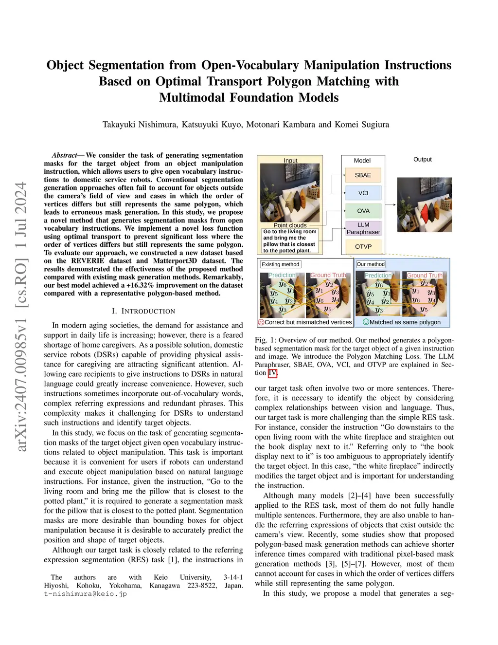 We consider the task of generating segmentation masks for the target object from an object manipulation instruction, which allows users to give open vocabulary instructions to domestic service robots. Conventional segmentation generation approaches often fail to account for objects outside the camera's field of view and cases in which the order of vertices differs but still represents the same polygon, which leads to erroneous mask generation. In this study, we propose a novel method that generates segmentation masks from open vocabulary instructions. We implement a novel loss function using optimal transport to prevent significant loss where the order of vertices differs but still represents the same polygon. To evaluate our approach, we constructed a new dataset based on the REVERIE dataset and Matterport3D dataset. The results demonstrated the effectiveness of the proposed method compared with existing mask generation methods. Remarkably, our best model achieved a +16.32% improvement on the dataset compared with a representative polygon-based method.