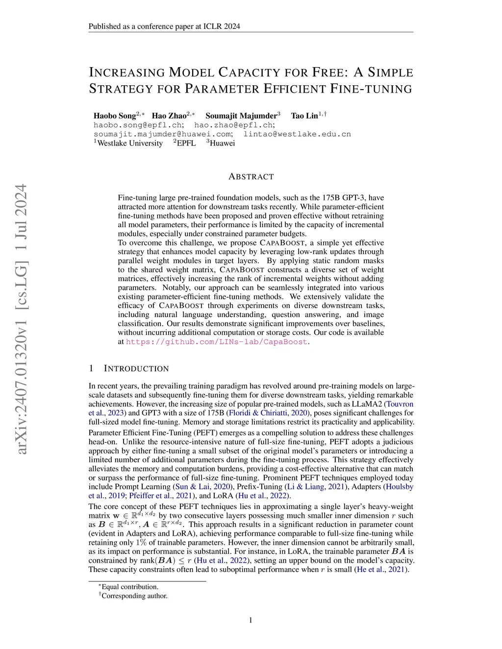 Fine-tuning large pre-trained foundation models, such as the 175B GPT-3, has attracted more attention for downstream tasks recently. While parameter-efficient fine-tuning methods have been proposed and proven effective without retraining all model parameters, their performance is limited by the capacity of incremental modules, especially under constrained parameter budgets. \\ To overcome this challenge, we propose CapaBoost, a simple yet effective strategy that enhances model capacity by leveraging low-rank updates through parallel weight modules in target layers. By applying static random masks to the shared weight matrix, CapaBoost constructs a diverse set of weight matrices, effectively increasing the rank of incremental weights without adding parameters. Notably, our approach can be seamlessly integrated into various existing parameter-efficient fine-tuning methods. We extensively validate the efficacy of CapaBoost through experiments on diverse downstream tasks, including natural language understanding, question answering, and image classification. Our results demonstrate significant improvements over baselines, without incurring additional computation or storage costs. Our code is available at \url{https://github.com/LINs-lab/CapaBoost}.
