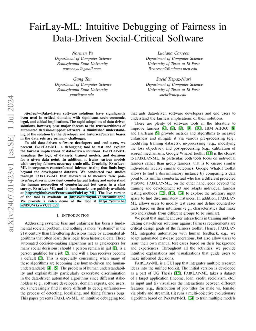 Data-driven software solutions have significantly been used in critical domains with significant socio-economic, legal, and ethical implications. The rapid adoptions of data-driven solutions, however, pose major threats to the trustworthiness of automated decision-support software. A diminished understanding of the solution by the developer and historical/current biases in the data sets are primary challenges. To aid data-driven software developers and end-users, we present \toolname, a debugging tool to test and explain the fairness implications of data-driven solutions. \toolname visualizes the logic of datasets, trained models, and decisions for a given data point. In addition, it trains various models with varying fairness-accuracy trade-offs. Crucially, \toolname incorporates counterfactual fairness testing that finds bugs beyond the development datasets. We conducted two studies through \toolname that allowed us to measure false positives/negatives in prevalent counterfactual testing and understand the human perception of counterfactual test cases in a class survey. \toolname and its benchmarks are publicly available at~\url{https://github.com/Pennswood/FairLay-ML}. The live version of the tool is available at~\url{https://fairlayml-v2.streamlit.app/}. We provide a video demo of the tool at https://youtu.be/wNI9UWkywVU?t=127