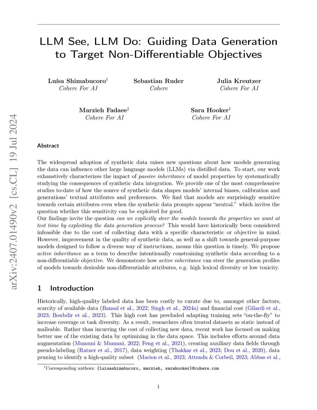 The widespread adoption of synthetic data raises new questions about how models generating the data can influence other large language models (LLMs) via distilled data. To start, our work exhaustively characterizes the impact of passive inheritance of model properties by systematically studying the consequences of synthetic data integration. We provide one of the most comprehensive studies to-date of how the source of synthetic data shapes models' internal biases, calibration and generations' textual attributes and preferences. We find that models are surprisingly sensitive towards certain attributes even when the synthetic data prompts appear "neutral". which invites the question whether this sensitivity can be exploited for good. Our findings invite the question can we explicitly steer the models towards the properties we want at test time by exploiting the data generation process? This would have historically been considered infeasible due to the cost of collecting data with a specific characteristic or objective in mind. However, improvement in the quality of synthetic data, as well as a shift towards general-purpose models designed to follow a diverse way of instructions, means this question is timely. We propose active inheritance as a term to describe intentionally constraining synthetic data according to a non-differentiable objective. We demonstrate how active inheritance can steer the generation profiles of models towards desirable non-differentiable attributes, e.g. high lexical diversity or low toxicity.