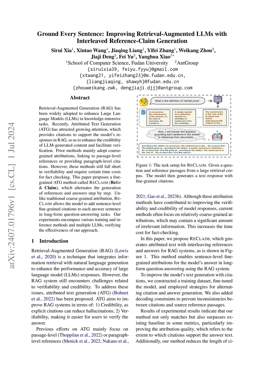 Retrieval-Augmented Generation (RAG) has been widely adopted to enhance Large Language Models (LLMs) in knowledge-intensive tasks. To enhance credibility and verifiability in RAG systems, Attributed Text Generation (ATG) is proposed, which provides citations to retrieval knowledge in LLM-generated responses. Prior methods mainly adopt coarse-grained attributions, with passage-level or paragraph-level references or citations, which fall short in verifiability. This paper proposes ReClaim (Refer & Claim), a fine-grained ATG method that alternates the generation of references and answers step by step. Different from previous coarse-grained attribution, ReClaim provides sentence-level citations in long-form question-answering tasks. With extensive experiments, we verify the effectiveness of ReClaim in extensive settings, achieving a citation accuracy rate of 90%.