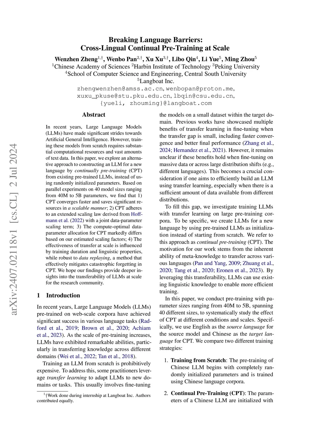 In recent years, Large Language Models (LLMs) have made significant strides towards Artificial General Intelligence. However, training these models from scratch requires substantial computational resources and vast amounts of text data. In this paper, we explore an alternative approach to constructing an LLM for a new language by continually pretraining (CPT) from existing pretrained LLMs, instead of using randomly initialized parameters. Based on parallel experiments on 40 model sizes ranging from 40M to 5B parameters, we find that 1) CPT converges faster and saves significant resources in a scalable manner; 2) CPT adheres to an extended scaling law derived from Hoffmann et al. (2022) with a joint data-parameter scaling term; 3) The compute-optimal data-parameter allocation for CPT markedly differs based on our estimated scaling factors; 4) The effectiveness of transfer at scale is influenced by training duration and linguistic properties, while robust to data replaying, a method that effectively mitigates catastrophic forgetting in CPT. We hope our findings provide deeper insights into the transferability of LLMs at scale for the research community.