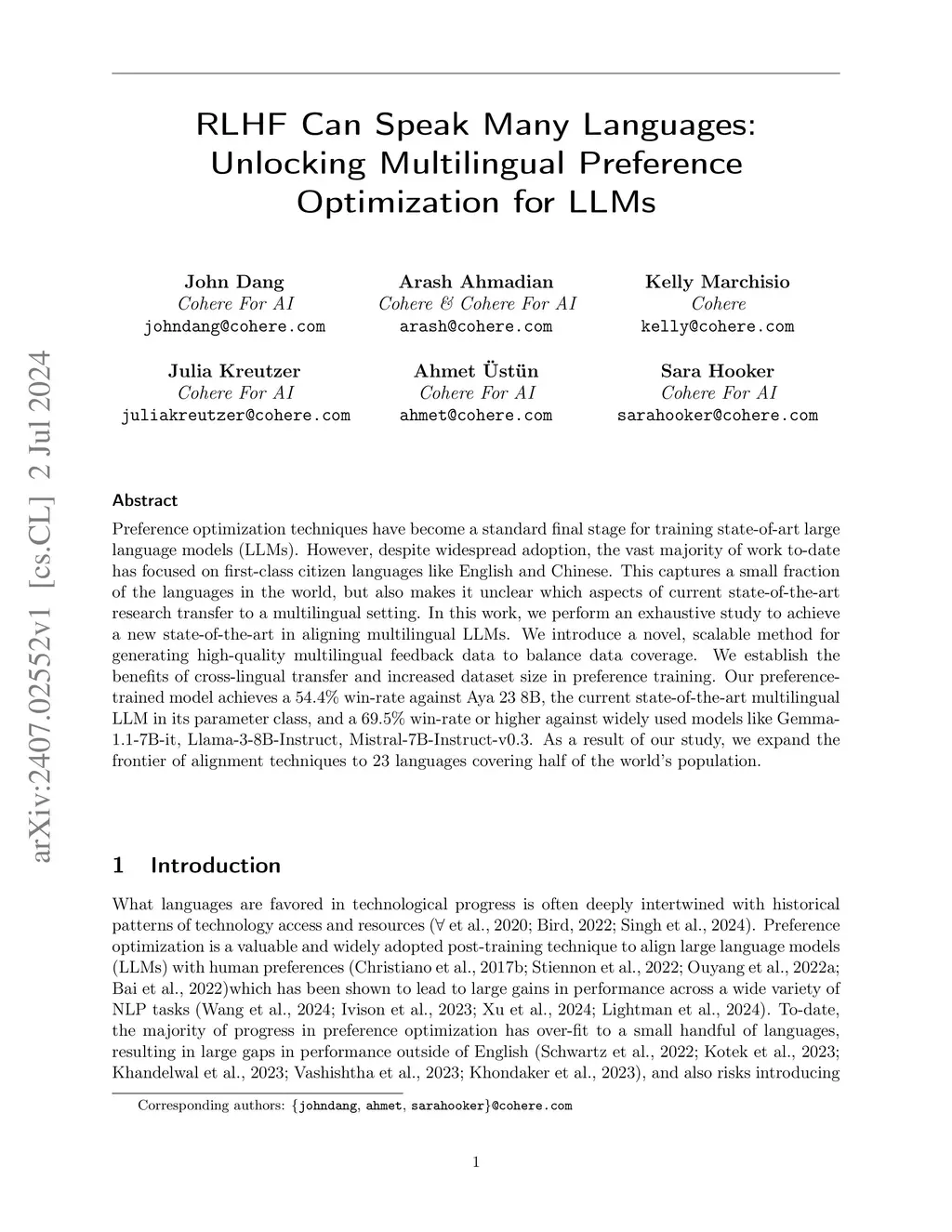 Preference optimization techniques have become a standard final stage for training state-of-art large language models (LLMs). However, despite widespread adoption, the vast majority of work to-date has focused on first-class citizen languages like English and Chinese. This captures a small fraction of the languages in the world, but also makes it unclear which aspects of current state-of-the-art research transfer to a multilingual setting. In this work, we perform an exhaustive study to achieve a new state-of-the-art in aligning multilingual LLMs. We introduce a novel, scalable method for generating high-quality multilingual feedback data to balance data coverage. We establish the benefits of cross-lingual transfer and increased dataset size in preference training. Our preference-trained model achieves a 54.4% win-rate against Aya 23 8B, the current state-of-the-art multilingual LLM in its parameter class, and a 69.5% win-rate or higher against widely used models like Gemma-1.1-7B-it, Llama-3-8B-Instruct, Mistral-7B-Instruct-v0.3. As a result of our study, we expand the frontier of alignment techniques to 23 languages covering half of the world's population.