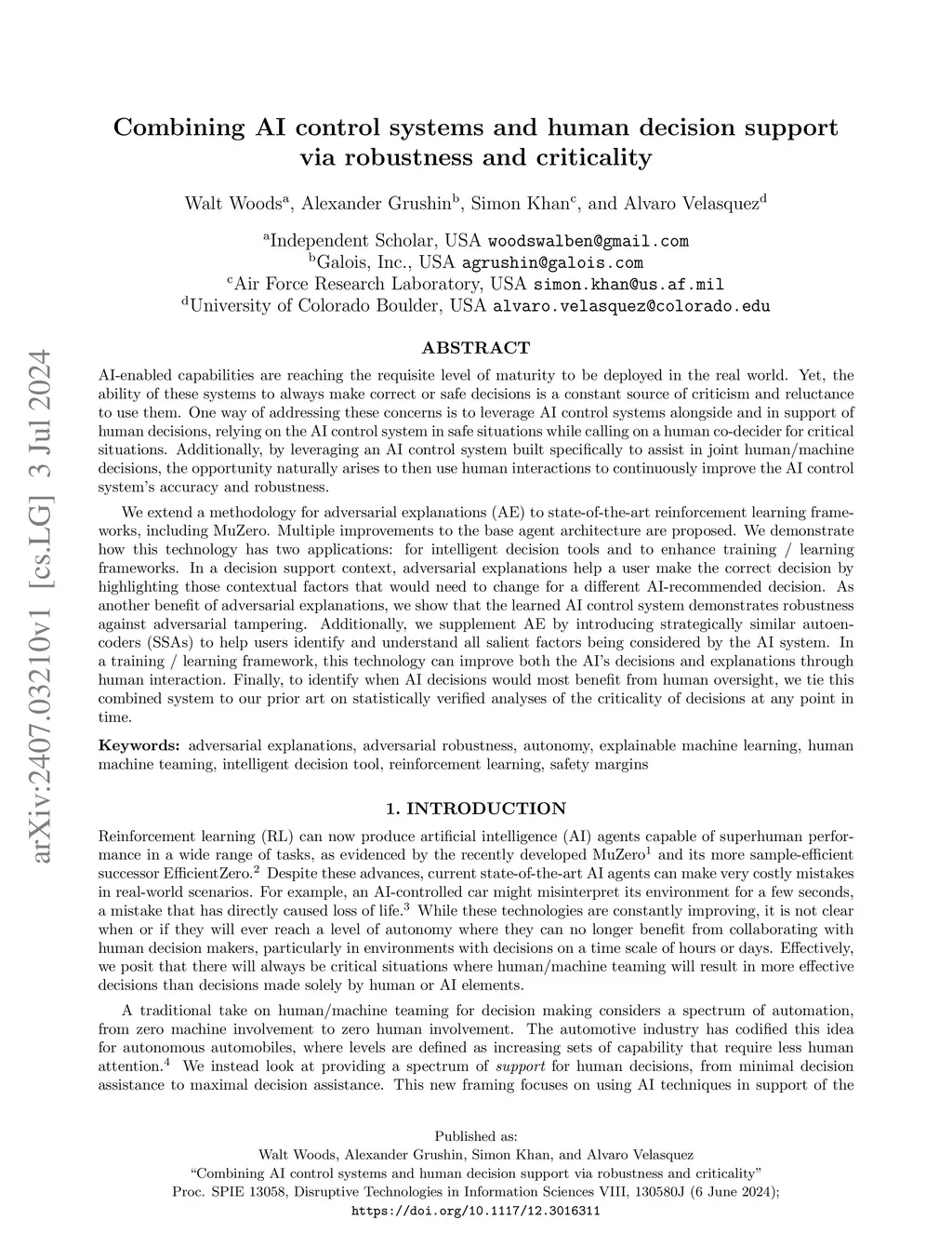 AI-enabled capabilities are reaching the requisite level of maturity to be deployed in the real world, yet do not always make correct or safe decisions. One way of addressing these concerns is to leverage AI control systems alongside and in support of human decisions, relying on the AI control system in safe situations while calling on a human co-decider for critical situations. We extend a methodology for adversarial explanations (AE) to state-of-the-art reinforcement learning frameworks, including MuZero. Multiple improvements to the base agent architecture are proposed. We demonstrate how this technology has two applications: for intelligent decision tools and to enhance training / learning frameworks. In a decision support context, adversarial explanations help a user make the correct decision by highlighting those contextual factors that would need to change for a different AI-recommended decision. As another benefit of adversarial explanations, we show that the learned AI control system demonstrates robustness against adversarial tampering. Additionally, we supplement AE by introducing strategically similar autoencoders (SSAs) to help users identify and understand all salient factors being considered by the AI system. In a training / learning framework, this technology can improve both the AI's decisions and explanations through human interaction. Finally, to identify when AI decisions would most benefit from human oversight, we tie this combined system to our prior art on statistically verified analyses of the criticality of decisions at any point in time.