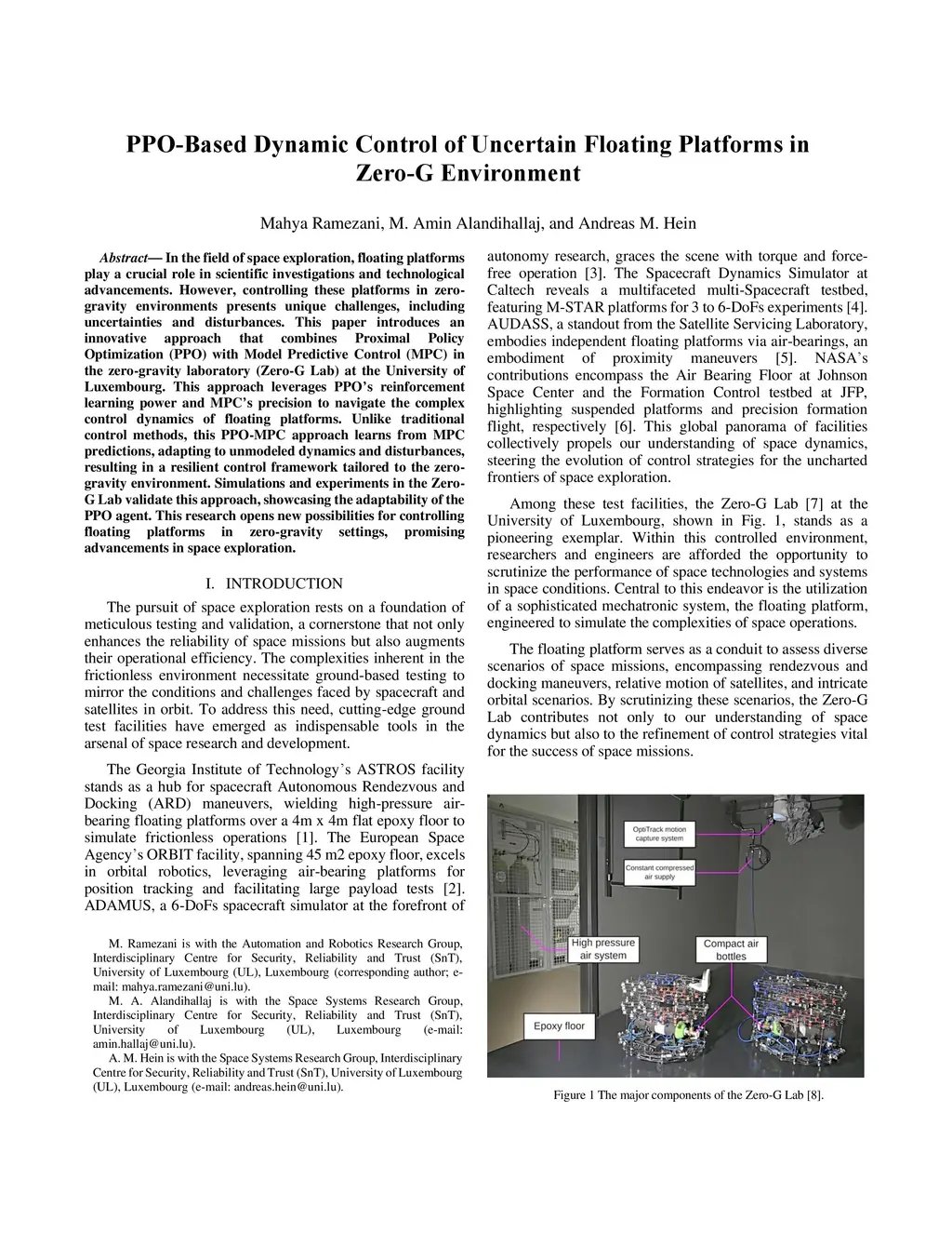In the field of space exploration, floating platforms play a crucial role in scientific investigations and technological advancements. However, controlling these platforms in zero-gravity environments presents unique challenges, including uncertainties and disturbances. This paper introduces an innovative approach that combines Proximal Policy Optimization (PPO) with Model Predictive Control (MPC) in the zero-gravity laboratory (Zero-G Lab) at the University of Luxembourg. This approach leverages PPO's reinforcement learning power and MPC's precision to navigate the complex control dynamics of floating platforms. Unlike traditional control methods, this PPO-MPC approach learns from MPC predictions, adapting to unmodeled dynamics and disturbances, resulting in a resilient control framework tailored to the zero-gravity environment. Simulations and experiments in the Zero-G Lab validate this approach, showcasing the adaptability of the PPO agent. This research opens new possibilities for controlling floating platforms in zero-gravity settings, promising advancements in space exploration.