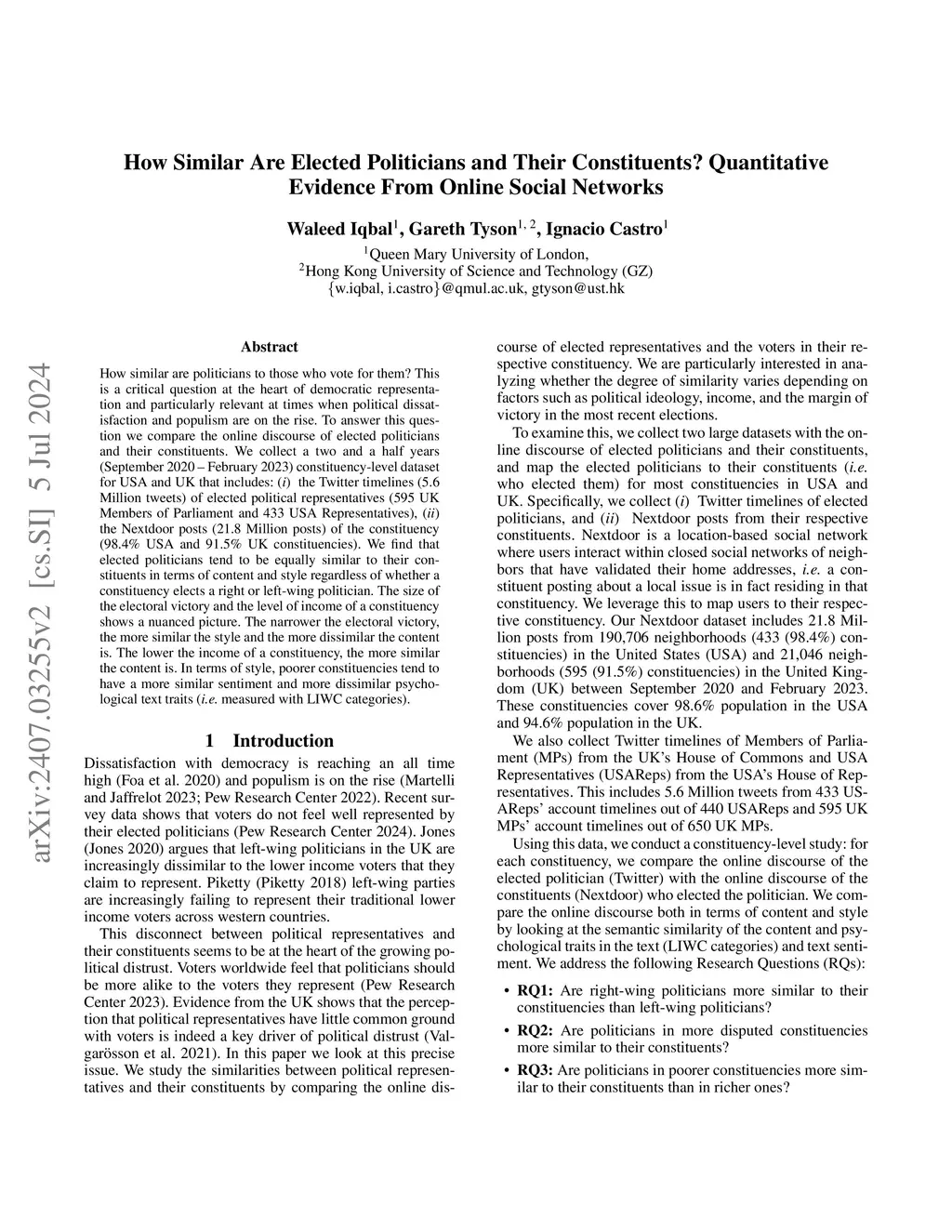 How similar are politicians to those who vote for them? This is a critical question at the heart of democratic representation and particularly relevant at times when political dissatisfaction and populism are on the rise. To answer this question we compare the online discourse of elected politicians and their constituents. We collect a two and a half years (September 2020 - February 2023) constituency-level dataset for USA and UK that includes: (i) the Twitter timelines (5.6 Million tweets) of elected political representatives (595 UK Members of Parliament and 433 USA Representatives), (ii) the Nextdoor posts (21.8 Million posts) of the constituency (98.4% USA and 91.5% UK constituencies). We find that elected politicians tend to be equally similar to their constituents in terms of content and style regardless of whether a constituency elects a right or left-wing politician. The size of the electoral victory and the level of income of a constituency shows a nuanced picture. The narrower the electoral victory, the more similar the style and the more dissimilar the content is. The lower the income of a constituency, the more similar the content is. In terms of style, poorer constituencies tend to have a more similar sentiment and more dissimilar psychological text traits (i.e. measured with LIWC categories).