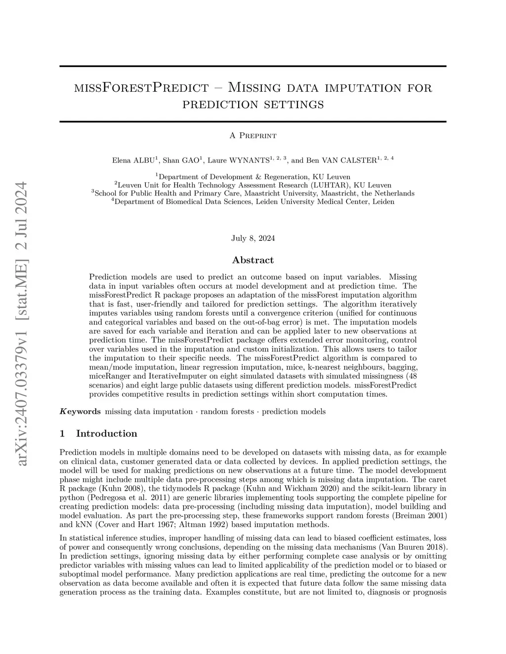 Prediction models are used to predict an outcome based on input variables. Missing data in input variables often occurs at model development and at prediction time. The missForestPredict R package proposes an adaptation of the missForest imputation algorithm that is fast, user-friendly and tailored for prediction settings. The algorithm iteratively imputes variables using random forests until a convergence criterion (unified for continuous and categorical variables and based on the out-of-bag error) is met. The imputation models are saved for each variable and iteration and can be applied later to new observations at prediction time. The missForestPredict package offers extended error monitoring, control over variables used in the imputation and custom initialization. This allows users to tailor the imputation to their specific needs. The missForestPredict algorithm is compared to mean/mode imputation, linear regression imputation, mice, k-nearest neighbours, bagging, miceRanger and IterativeImputer on eight simulated datasets with simulated missingness (48 scenarios) and eight large public datasets using different prediction models. missForestPredict provides competitive results in prediction settings within short computation times.