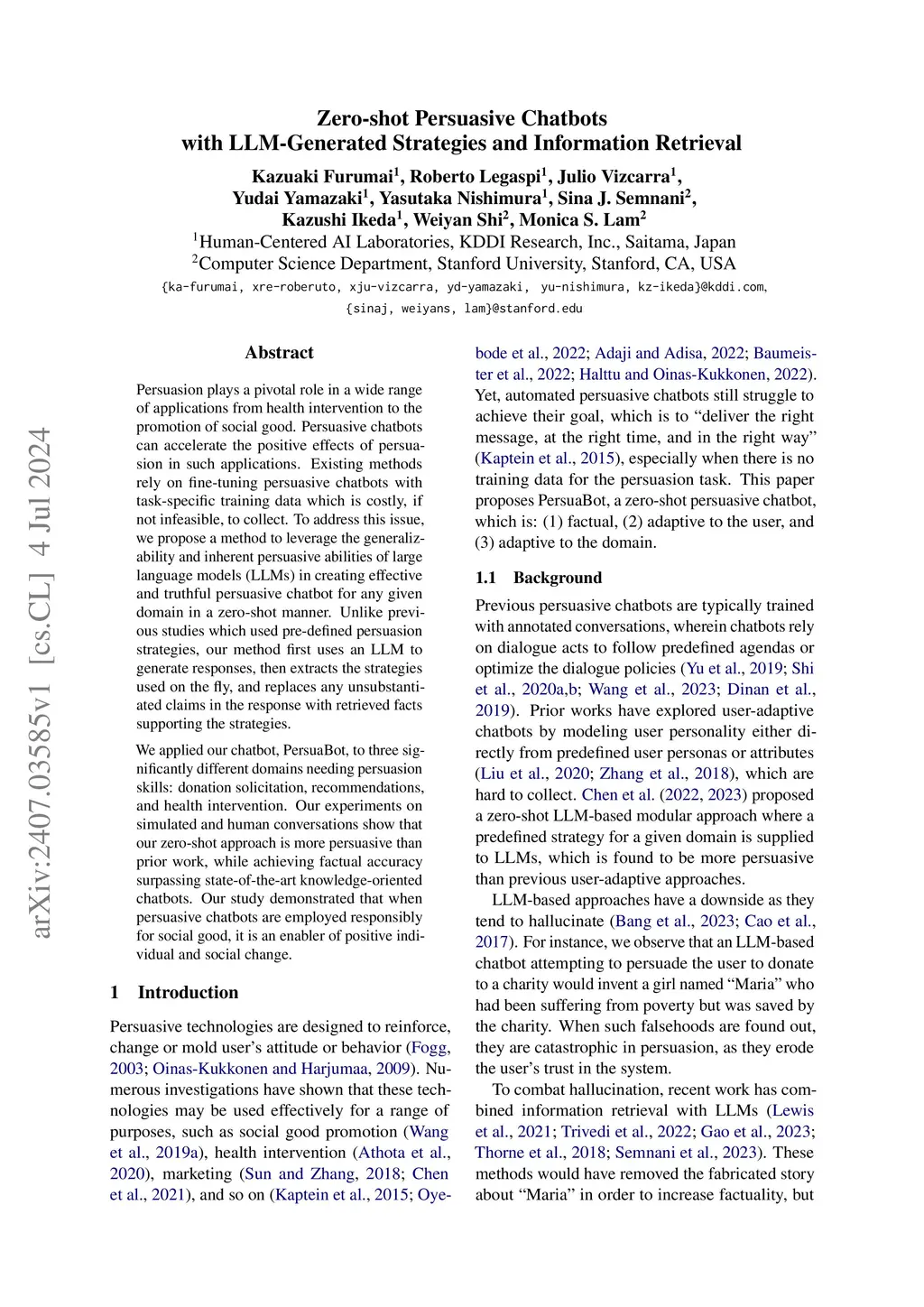 Persuasion plays a pivotal role in a wide range of applications from health intervention to the promotion of social good. Persuasive chatbots can accelerate the positive effects of persuasion in such applications. Existing methods rely on fine-tuning persuasive chatbots with task-specific training data which is costly, if not infeasible, to collect. To address this issue, we propose a method to leverage the generalizability and inherent persuasive abilities of large language models (LLMs) in creating effective and truthful persuasive chatbot for any given domain in a zero-shot manner. Unlike previous studies which used pre-defined persuasion strategies, our method first uses an LLM to generate responses, then extracts the strategies used on the fly, and replaces any unsubstantiated claims in the response with retrieved facts supporting the strategies. We applied our chatbot, PersuaBot, to three significantly different domains needing persuasion skills: donation solicitation, recommendations, and health intervention. Our experiments on simulated and human conversations show that our zero-shot approach is more persuasive than prior work, while achieving factual accuracy surpassing state-of-the-art knowledge-oriented chatbots. Our study demonstrated that when persuasive chatbots are employed responsibly for social good, it is an enabler of positive individual and social change.