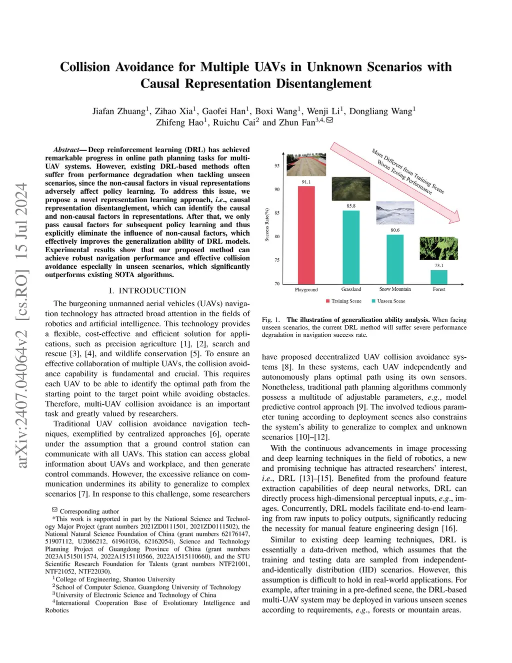 Deep reinforcement learning (DRL) has achieved remarkable progress in online path planning tasks for multi-UAV systems. However, existing DRL-based methods often suffer from performance degradation when tackling unseen scenarios, since the non-causal factors in visual representations adversely affect policy learning. To address this issue, we propose a novel representation learning approach, \ie, causal representation disentanglement, which can identify the causal and non-causal factors in representations. After that, we only pass causal factors for subsequent policy learning and thus explicitly eliminate the influence of non-causal factors, which effectively improves the generalization ability of DRL models. Experimental results show that our proposed method can achieve robust navigation performance and effective collision avoidance especially in unseen scenarios, which significantly outperforms existing SOTA algorithms.