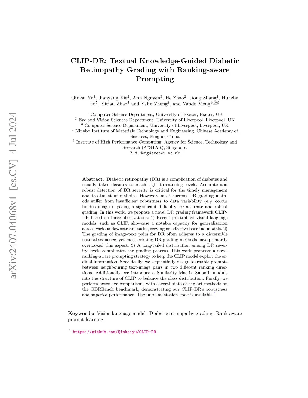 Diabetic retinopathy (DR) is a complication of diabetes and usually takes decades to reach sight-threatening levels. Accurate and robust detection of DR severity is critical for the timely management and treatment of diabetes. However, most current DR grading methods suffer from insufficient robustness to data variability (\textit{e.g.} colour fundus images), posing a significant difficulty for accurate and robust grading. In this work, we propose a novel DR grading framework CLIP-DR based on three observations: 1) Recent pre-trained visual language models, such as CLIP, showcase a notable capacity for generalisation across various downstream tasks, serving as effective baseline models. 2) The grading of image-text pairs for DR often adheres to a discernible natural sequence, yet most existing DR grading methods have primarily overlooked this aspect. 3) A long-tailed distribution among DR severity levels complicates the grading process. This work proposes a novel ranking-aware prompting strategy to help the CLIP model exploit the ordinal information. Specifically, we sequentially design learnable prompts between neighbouring text-image pairs in two different ranking directions. Additionally, we introduce a Similarity Matrix Smooth module into the structure of CLIP to balance the class distribution. Finally, we perform extensive comparisons with several state-of-the-art methods on the GDRBench benchmark, demonstrating our CLIP-DR's robustness and superior performance. The implementation code is available \footnote{\url{https://github.com/Qinkaiyu/CLIP-DR}
