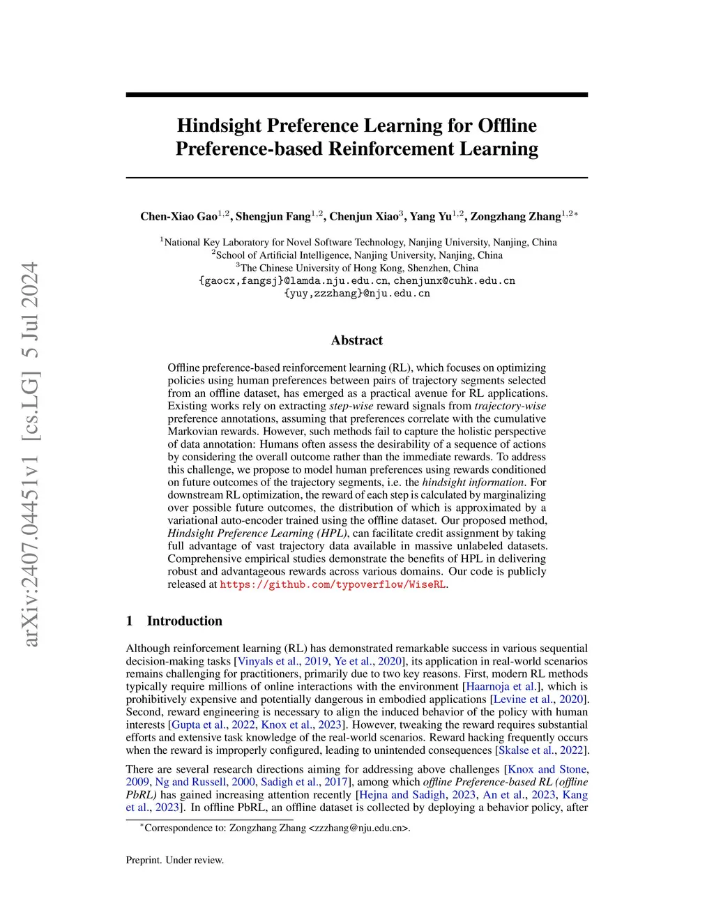 Offline preference-based reinforcement learning (RL), which focuses on optimizing policies using human preferences between pairs of trajectory segments selected from an offline dataset, has emerged as a practical avenue for RL applications. Existing works rely on extracting step-wise reward signals from trajectory-wise preference annotations, assuming that preferences correlate with the cumulative Markovian rewards. However, such methods fail to capture the holistic perspective of data annotation: Humans often assess the desirability of a sequence of actions by considering the overall outcome rather than the immediate rewards. To address this challenge, we propose to model human preferences using rewards conditioned on future outcomes of the trajectory segments, i.e. the hindsight information. For downstream RL optimization, the reward of each step is calculated by marginalizing over possible future outcomes, the distribution of which is approximated by a variational auto-encoder trained using the offline dataset. Our proposed method, Hindsight Preference Learning (HPL), can facilitate credit assignment by taking full advantage of vast trajectory data available in massive unlabeled datasets. Comprehensive empirical studies demonstrate the benefits of HPL in delivering robust and advantageous rewards across various domains. Our code is publicly released at https://github.com/typoverflow/WiseRL.