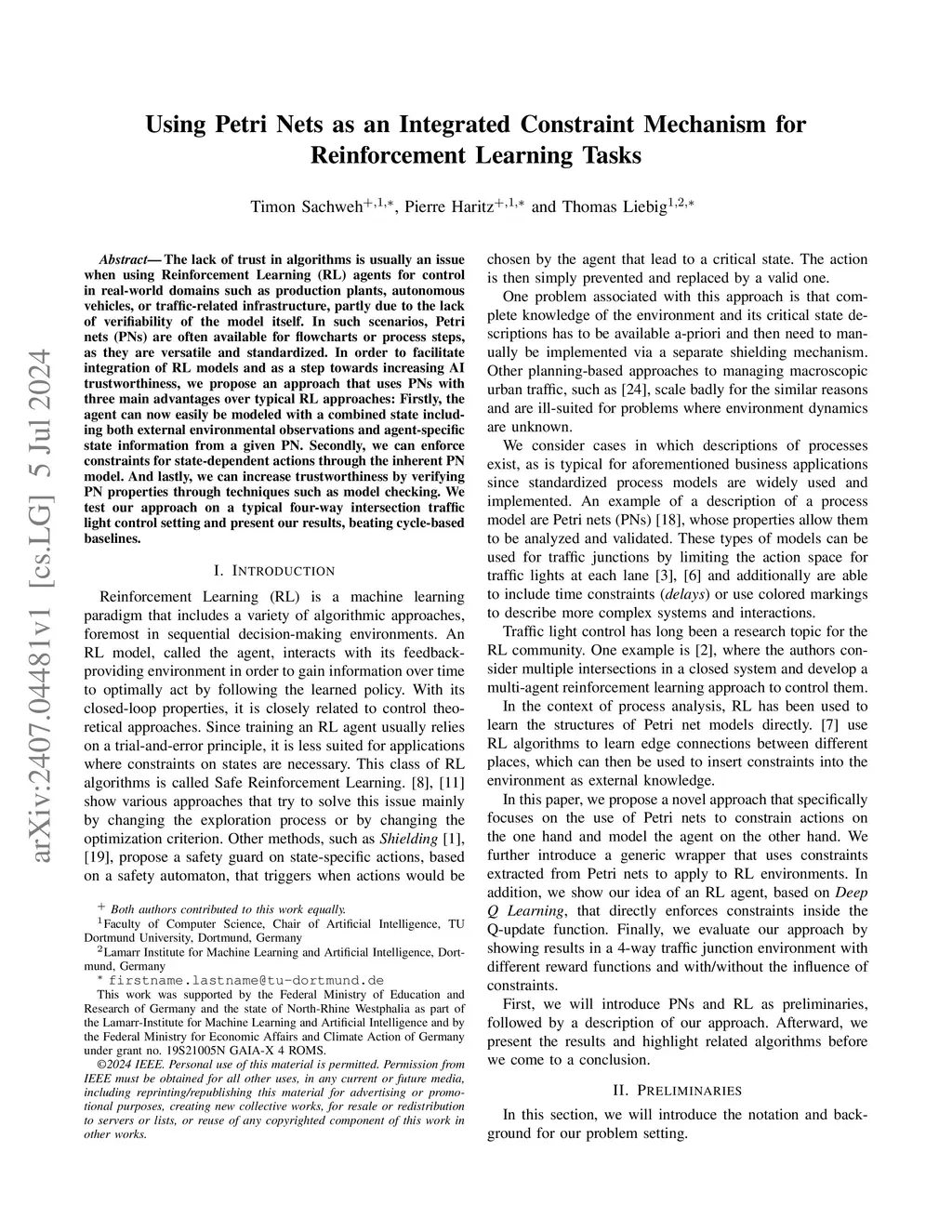The lack of trust in algorithms is usually an issue when using Reinforcement Learning (RL) agents for control in real-world domains such as production plants, autonomous vehicles, or traffic-related infrastructure, partly due to the lack of verifiability of the model itself. In such scenarios, Petri nets (PNs) are often available for flowcharts or process steps, as they are versatile and standardized. In order to facilitate integration of RL models and as a step towards increasing AI trustworthiness, we propose an approach that uses PNs with three main advantages over typical RL approaches: Firstly, the agent can now easily be modeled with a combined state including both external environmental observations and agent-specific state information from a given PN. Secondly, we can enforce constraints for state-dependent actions through the inherent PN model. And lastly, we can increase trustworthiness by verifying PN properties through techniques such as model checking. We test our approach on a typical four-way intersection traffic light control setting and present our results, beating cycle-based baselines.