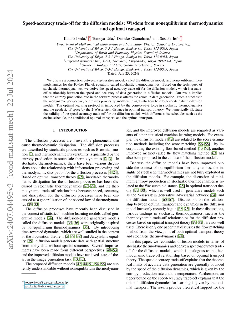 We discuss a connection between a generative model, called the diffusion model, and nonequilibrium thermodynamics for the Fokker-Planck equation, called stochastic thermodynamics. Using techniques from stochastic thermodynamics, we derive the speed-accuracy relations for diffusion models, which are inequalities that relate the accuracy of data generation to the entropy production rate. This relation can be interpreted as the speed of the diffusion dynamics in the absence of the non-conservative force. From a stochastic thermodynamic perspective, our results provide quantitative insight into how best to generate data in diffusion models. The optimal learning protocol is introduced by the geodesic of space of the 2-Wasserstein distance in optimal transport theory. We numerically illustrate the validity of the speed-accuracy relations for diffusion models with different noise schedules and different data. We numerically discuss our results for optimal and suboptimal learning protocols. We also demonstrate the applicability of our results to data generation from the real-world image datasets.