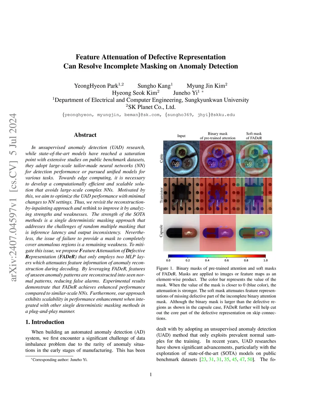 In unsupervised anomaly detection (UAD) research, while state-of-the-art models have reached a saturation point with extensive studies on public benchmark datasets, they adopt large-scale tailor-made neural networks (NN) for detection performance or pursued unified models for various tasks. Towards edge computing, it is necessary to develop a computationally efficient and scalable solution that avoids large-scale complex NNs. Motivated by this, we aim to optimize the UAD performance with minimal changes to NN settings. Thus, we revisit the reconstruction-by-inpainting approach and rethink to improve it by analyzing strengths and weaknesses. The strength of the SOTA methods is a single deterministic masking approach that addresses the challenges of random multiple masking that is inference latency and output inconsistency. Nevertheless, the issue of failure to provide a mask to completely cover anomalous regions is a remaining weakness. To mitigate this issue, we propose Feature Attenuation of Defective Representation (FADeR) that only employs two MLP layers which attenuates feature information of anomaly reconstruction during decoding. By leveraging FADeR, features of unseen anomaly patterns are reconstructed into seen normal patterns, reducing false alarms. Experimental results demonstrate that FADeR achieves enhanced performance compared to similar-scale NNs. Furthermore, our approach exhibits scalability in performance enhancement when integrated with other single deterministic masking methods in a plug-and-play manner.