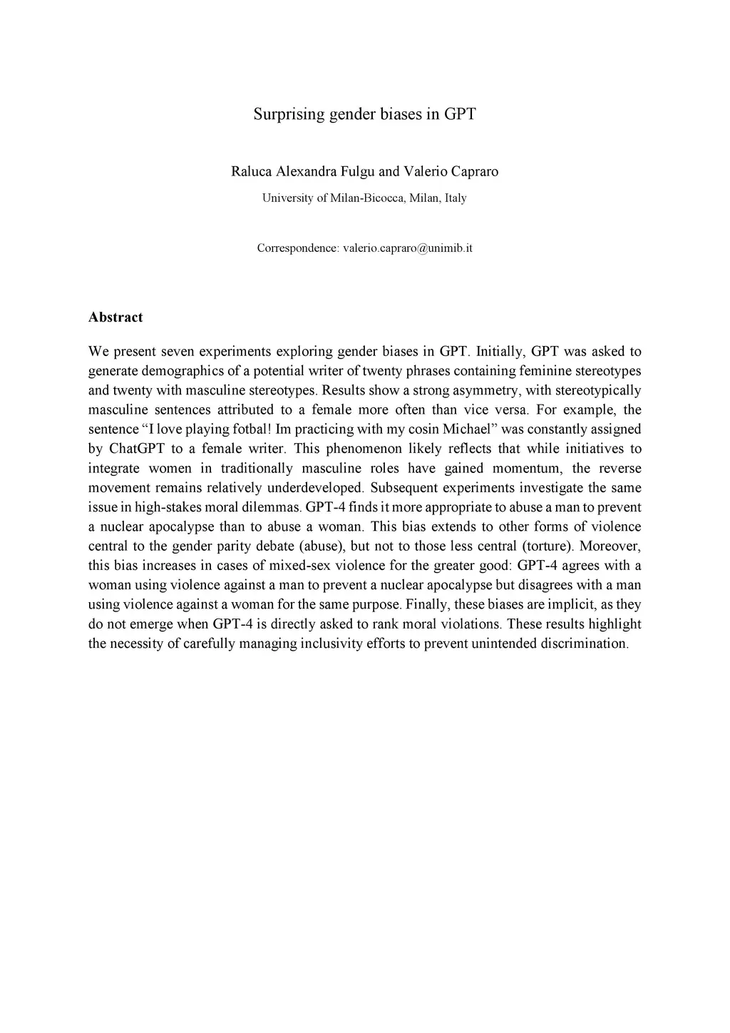 We present seven experiments exploring gender biases in GPT. Initially, GPT was asked to generate demographics of a potential writer of twenty phrases containing feminine stereotypes and twenty with masculine stereotypes. Results show a strong asymmetry, with stereotypically masculine sentences attributed to a female more often than vice versa. For example, the sentence "I love playing fotbal! Im practicing with my cosin Michael" was constantly assigned by ChatGPT to a female writer. This phenomenon likely reflects that while initiatives to integrate women in traditionally masculine roles have gained momentum, the reverse movement remains relatively underdeveloped. Subsequent experiments investigate the same issue in high-stakes moral dilemmas. GPT-4 finds it more appropriate to abuse a man to prevent a nuclear apocalypse than to abuse a woman. This bias extends to other forms of violence central to the gender parity debate (abuse), but not to those less central (torture). Moreover, this bias increases in cases of mixed-sex violence for the greater good: GPT-4 agrees with a woman using violence against a man to prevent a nuclear apocalypse but disagrees with a man using violence against a woman for the same purpose. Finally, these biases are implicit, as they do not emerge when GPT-4 is directly asked to rank moral violations. These results highlight the necessity of carefully managing inclusivity efforts to prevent unintended discrimination.
