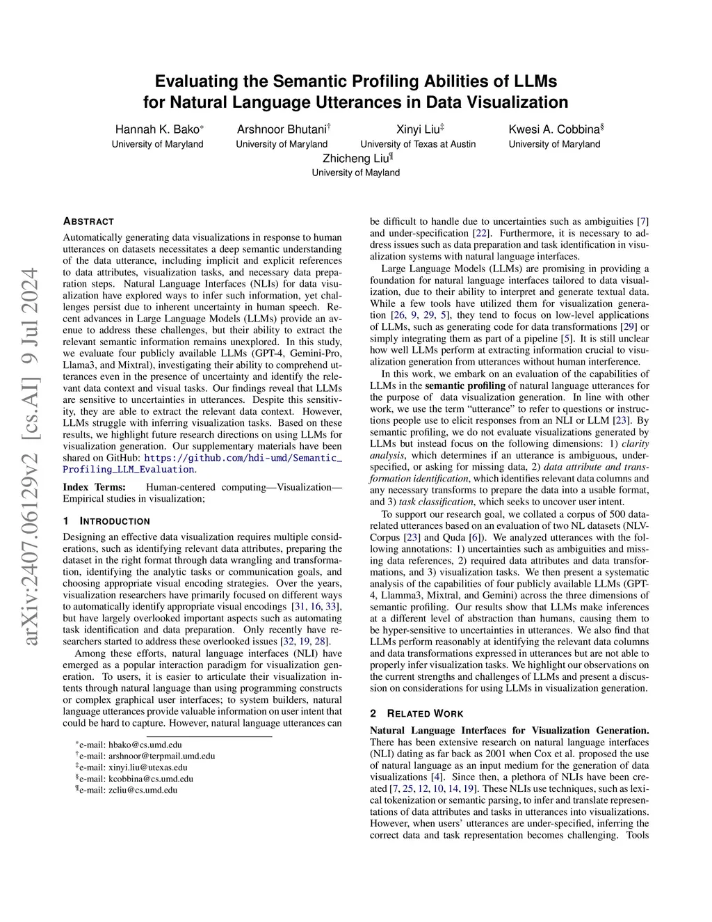 Automatically generating data visualizations in response to human utterances on datasets necessitates a deep semantic understanding of the data utterance, including implicit and explicit references to data attributes, visualization tasks, and necessary data preparation steps. Natural Language Interfaces (NLIs) for data visualization have explored ways to infer such information, yet challenges persist due to inherent uncertainty in human speech. Recent advances in Large Language Models (LLMs) provide an avenue to address these challenges, but their ability to extract the relevant semantic information remains unexplored. In this study, we evaluate four publicly available LLMs (GPT-4, Gemini-Pro, Llama3, and Mixtral), investigating their ability to comprehend utterances even in the presence of uncertainty and identify the relevant data context and visual tasks. Our findings reveal that LLMs are sensitive to uncertainties in utterances. Despite this sensitivity, they are able to extract the relevant data context. However, LLMs struggle with inferring visualization tasks. Based on these results, we highlight future research directions on using LLMs for visualization generation.