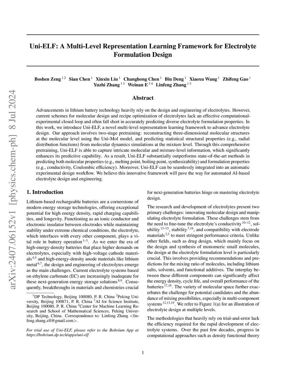 Advancements in lithium battery technology heavily rely on the design and engineering of electrolytes. However, current schemes for molecular design and recipe optimization of electrolytes lack an effective computational-experimental closed loop and often fall short in accurately predicting diverse electrolyte formulation properties. In this work, we introduce Uni-ELF, a novel multi-level representation learning framework to advance electrolyte design. Our approach involves two-stage pretraining: reconstructing three-dimensional molecular structures at the molecular level using the Uni-Mol model, and predicting statistical structural properties (e.g., radial distribution functions) from molecular dynamics simulations at the mixture level. Through this comprehensive pretraining, Uni-ELF is able to capture intricate molecular and mixture-level information, which significantly enhances its predictive capability. As a result, Uni-ELF substantially outperforms state-of-the-art methods in predicting both molecular properties (e.g., melting point, boiling point, synthesizability) and formulation properties (e.g., conductivity, Coulombic efficiency). Moreover, Uni-ELF can be seamlessly integrated into an automatic experimental design workflow. We believe this innovative framework will pave the way for automated AI-based electrolyte design and engineering.