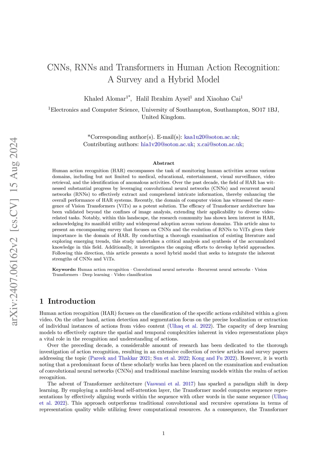Human Action Recognition (HAR) encompasses the task of monitoring human activities across various domains, including but not limited to medical, educational, entertainment, visual surveillance, video retrieval, and the identification of anomalous activities. Over the past decade, the field of HAR has witnessed substantial progress by leveraging Convolutional Neural Networks (CNNs) to effectively extract and comprehend intricate information, thereby enhancing the overall performance of HAR systems. Recently, the domain of computer vision has witnessed the emergence of Vision Transformers (ViTs) as a potent solution. The efficacy of transformer architecture has been validated beyond the confines of image analysis, extending their applicability to diverse video-related tasks. Notably, within this landscape, the research community has shown keen interest in HAR, acknowledging its manifold utility and widespread adoption across various domains. This article aims to present an encompassing survey that focuses on CNNs and the evolution of Recurrent Neural Networks (RNNs) to ViTs given their importance in the domain of HAR. By conducting a thorough examination of existing literature and exploring emerging trends, this study undertakes a critical analysis and synthesis of the accumulated knowledge in this field. Additionally, it investigates the ongoing efforts to develop hybrid approaches. Following this direction, this article presents a novel hybrid model that seeks to integrate the inherent strengths of CNNs and ViTs.