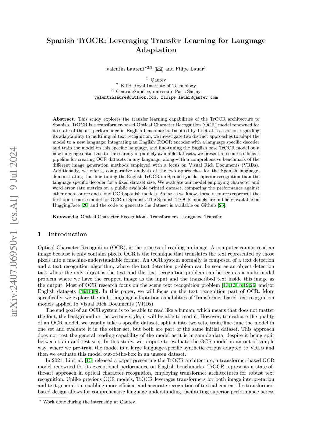 This study explores the transfer learning capabilities of the TrOCR architecture to Spanish. TrOCR is a transformer-based Optical Character Recognition (OCR) model renowned for its state-of-the-art performance in English benchmarks. Inspired by Li et al. assertion regarding its adaptability to multilingual text recognition, we investigate two distinct approaches to adapt the model to a new language: integrating an English TrOCR encoder with a language specific decoder and train the model on this specific language, and fine-tuning the English base TrOCR model on a new language data. Due to the scarcity of publicly available datasets, we present a resource-efficient pipeline for creating OCR datasets in any language, along with a comprehensive benchmark of the different image generation methods employed with a focus on Visual Rich Documents (VRDs). Additionally, we offer a comparative analysis of the two approaches for the Spanish language, demonstrating that fine-tuning the English TrOCR on Spanish yields superior recognition than the language specific decoder for a fixed dataset size. We evaluate our model employing character and word error rate metrics on a public available printed dataset, comparing the performance against other open-source and cloud OCR spanish models. As far as we know, these resources represent the best open-source model for OCR in Spanish. The Spanish TrOCR models are publicly available on HuggingFace [20] and the code to generate the dataset is available on Github [25].
