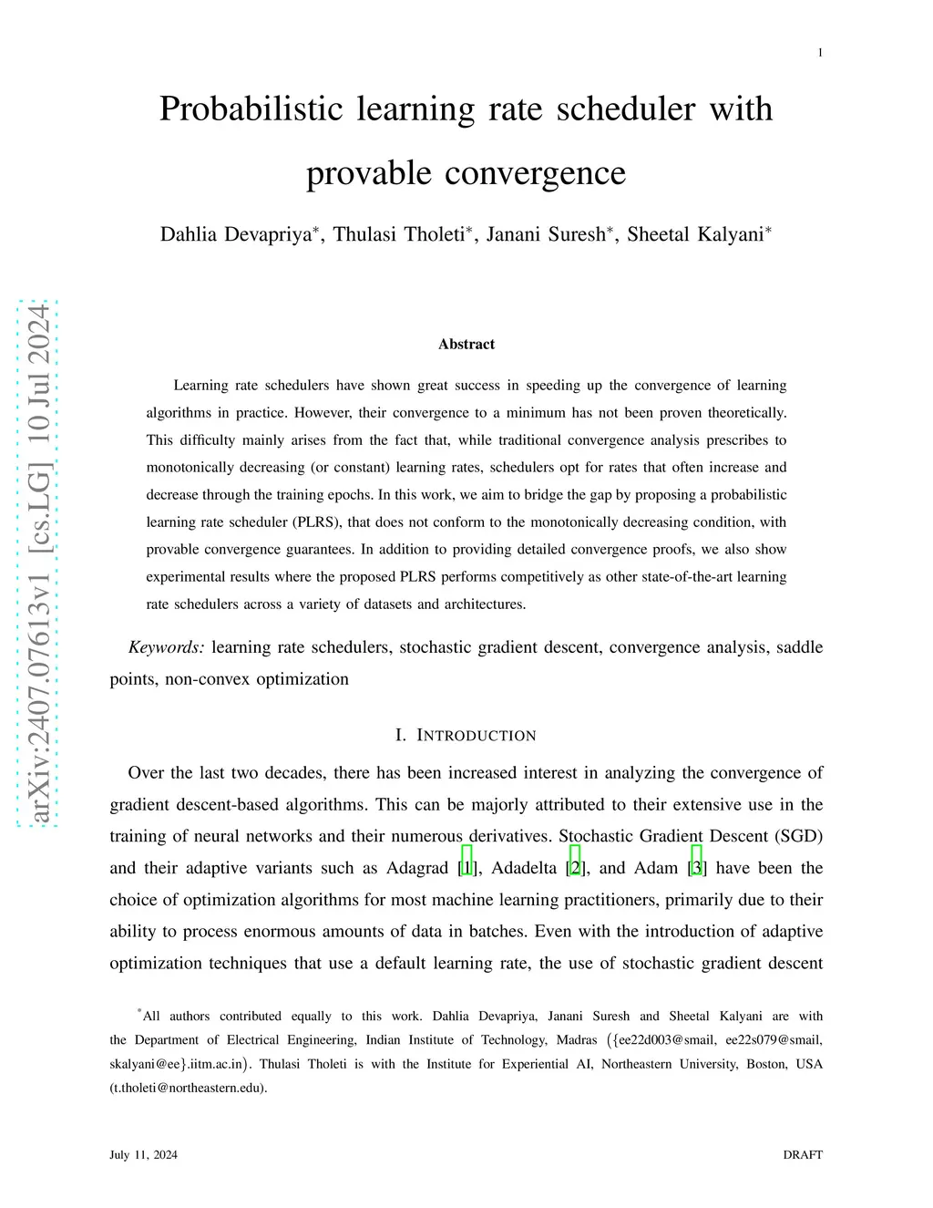 Learning rate schedulers have shown great success in speeding up the convergence of learning algorithms in practice. However, their convergence to a minimum has not been proven theoretically. This difficulty mainly arises from the fact that, while traditional convergence analysis prescribes to monotonically decreasing (or constant) learning rates, schedulers opt for rates that often increase and decrease through the training epochs. In this work, we aim to bridge the gap by proposing a probabilistic learning rate scheduler (PLRS) that does not conform to the monotonically decreasing condition, with provable convergence guarantees. To cement the relevance and utility of our work in modern day applications, we show experimental results on deep neural network architectures such as ResNet, WRN, VGG, and DenseNet on CIFAR-10, CIFAR-100, and Tiny ImageNet datasets. We show that PLRS performs as well as or better than existing state-of-the-art learning rate schedulers in terms of convergence as well as accuracy. For example, while training ResNet-110 on the CIFAR-100 dataset, we outperform the state-of-the-art knee scheduler by in terms of classification accuracy. Furthermore, on the Tiny ImageNet dataset using ResNet-50 architecture, we show a significantly more stable convergence than the cosine scheduler and a better classification accuracy than the existing schedulers.