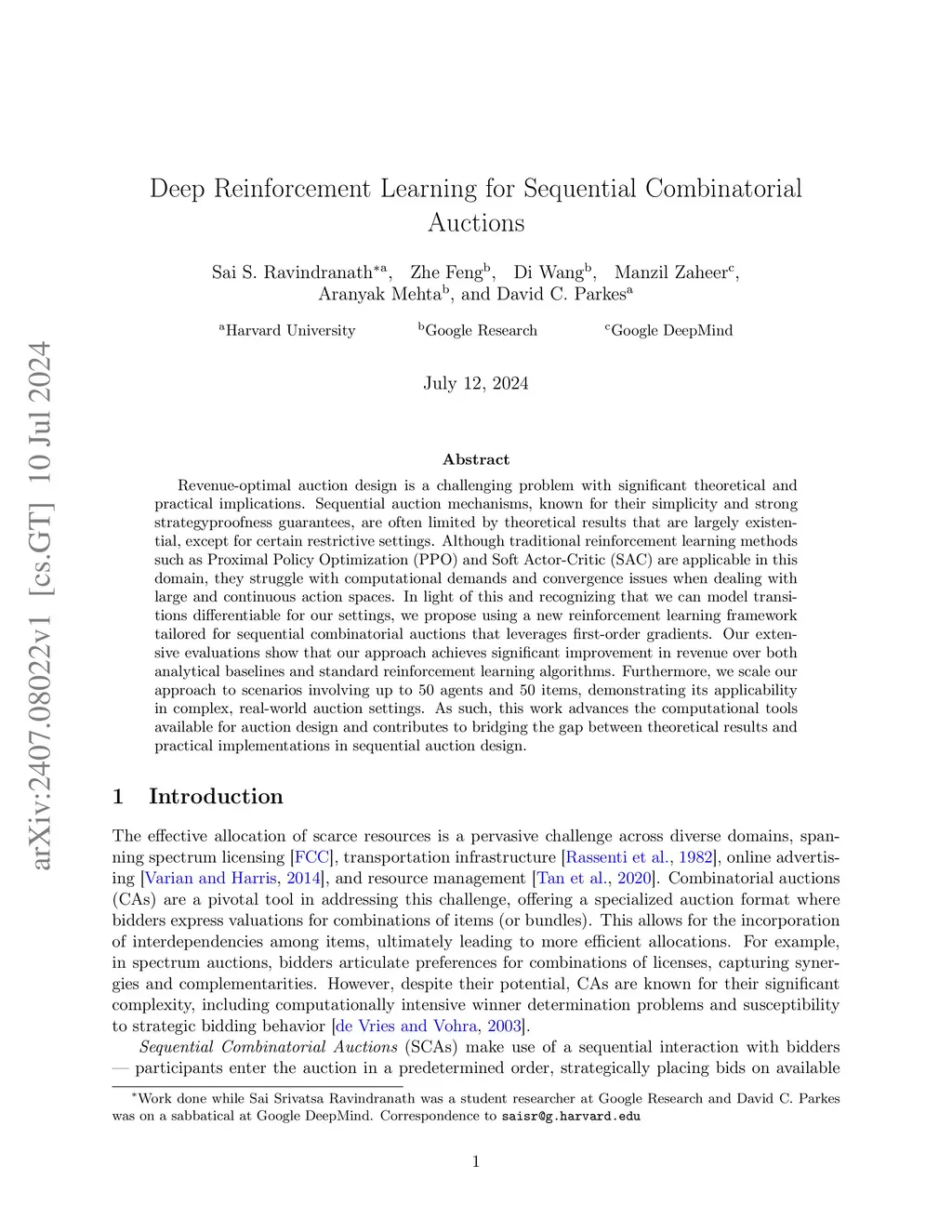 Revenue-optimal auction design is a challenging problem with significant theoretical and practical implications. Sequential auction mechanisms, known for their simplicity and strong strategyproofness guarantees, are often limited by theoretical results that are largely existential, except for certain restrictive settings. Although traditional reinforcement learning methods such as Proximal Policy Optimization (PPO) and Soft Actor-Critic (SAC) are applicable in this domain, they struggle with computational demands and convergence issues when dealing with large and continuous action spaces. In light of this and recognizing that we can model transitions differentiable for our settings, we propose using a new reinforcement learning framework tailored for sequential combinatorial auctions that leverages first-order gradients. Our extensive evaluations show that our approach achieves significant improvement in revenue over both analytical baselines and standard reinforcement learning algorithms. Furthermore, we scale our approach to scenarios involving up to 50 agents and 50 items, demonstrating its applicability in complex, real-world auction settings. As such, this work advances the computational tools available for auction design and contributes to bridging the gap between theoretical results and practical implementations in sequential auction design.