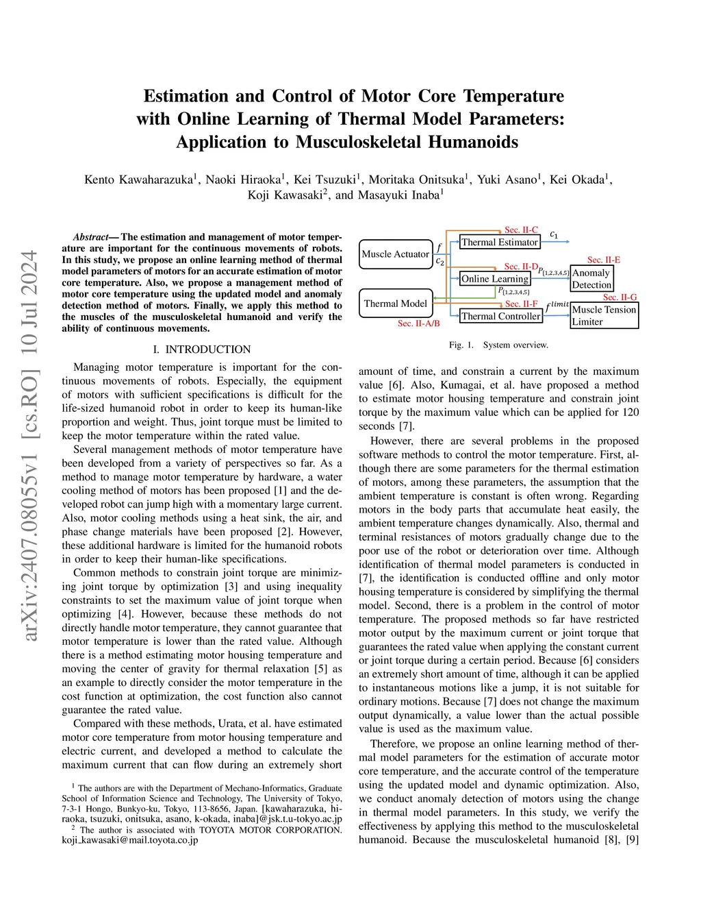 The estimation and management of motor temperature are important for the continuous movements of robots. In this study, we propose an online learning method of thermal model parameters of motors for an accurate estimation of motor core temperature. Also, we propose a management method of motor core temperature using the updated model and anomaly detection method of motors. Finally, we apply this method to the muscles of the musculoskeletal humanoid and verify the ability of continuous movements.
