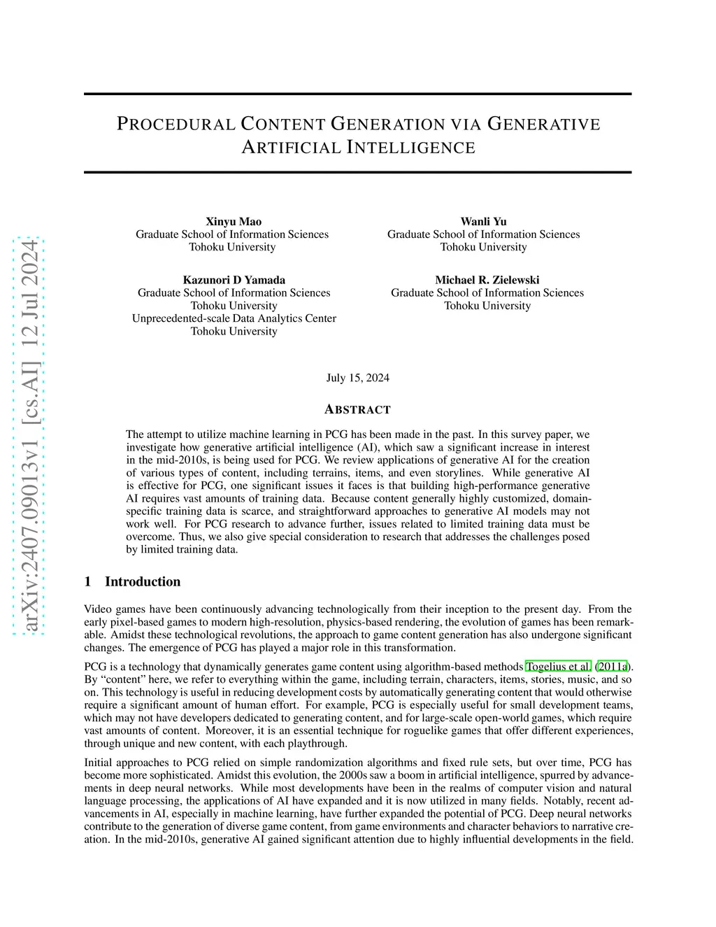 The attempt to utilize machine learning in PCG has been made in the past. In this survey paper, we investigate how generative artificial intelligence (AI), which saw a significant increase in interest in the mid-2010s, is being used for PCG. We review applications of generative AI for the creation of various types of content, including terrains, items, and even storylines. While generative AI is effective for PCG, one significant issues it faces is that building high-performance generative AI requires vast amounts of training data. Because content generally highly customized, domain-specific training data is scarce, and straightforward approaches to generative AI models may not work well. For PCG research to advance further, issues related to limited training data must be overcome. Thus, we also give special consideration to research that addresses the challenges posed by limited training data.