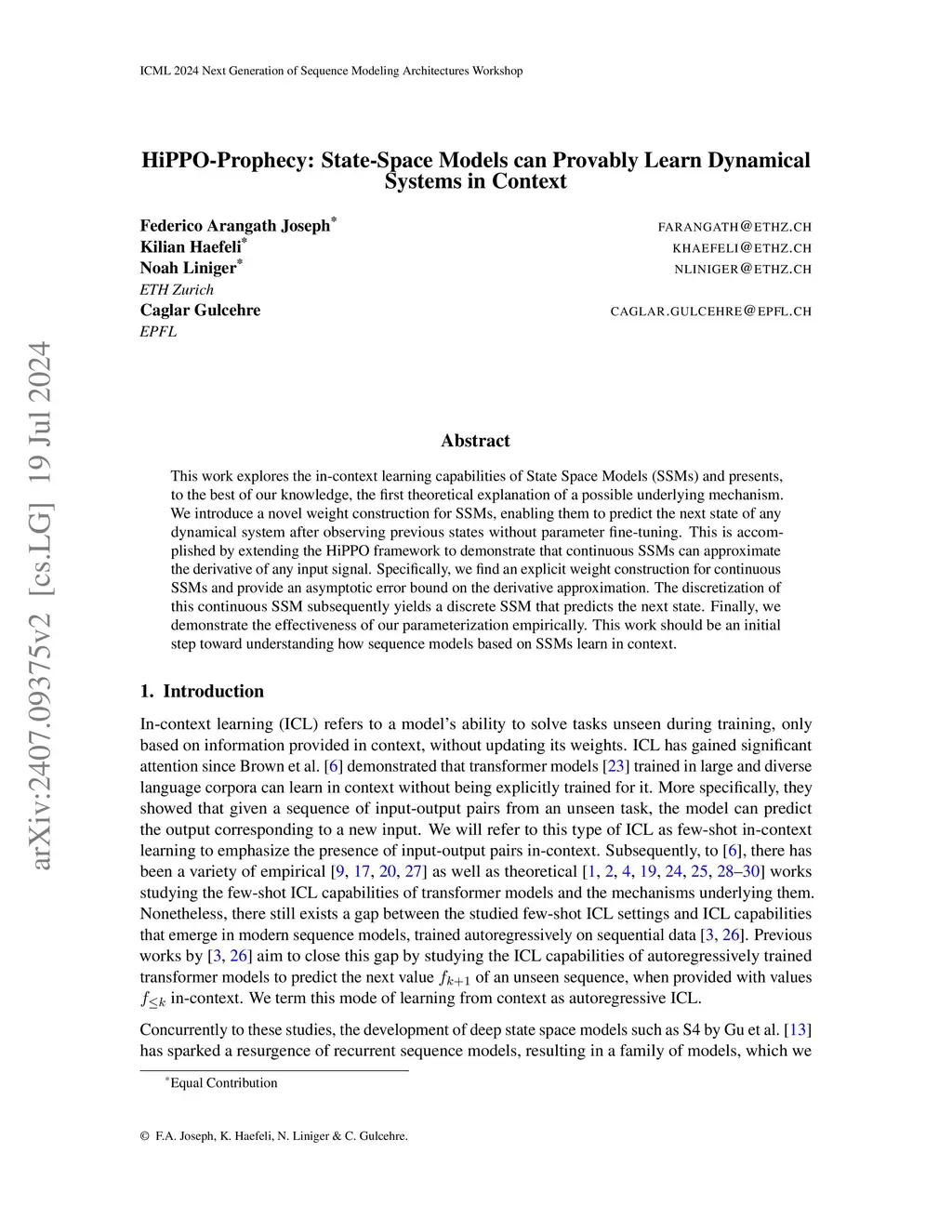 This work explores the in-context learning capabilities of State Space Models (SSMs) and presents, to the best of our knowledge, the first theoretical explanation of a possible underlying mechanism. We introduce a novel weight construction for SSMs, enabling them to predict the next state of any dynamical system after observing previous states without parameter fine-tuning. This is accomplished by extending the HiPPO framework to demonstrate that continuous SSMs can approximate the derivative of any input signal. Specifically, we find an explicit weight construction for continuous SSMs and provide an asymptotic error bound on the derivative approximation. The discretization of this continuous SSM subsequently yields a discrete SSM that predicts the next state. Finally, we demonstrate the effectiveness of our parameterization empirically. This work should be an initial step toward understanding how sequence models based on SSMs learn in context.