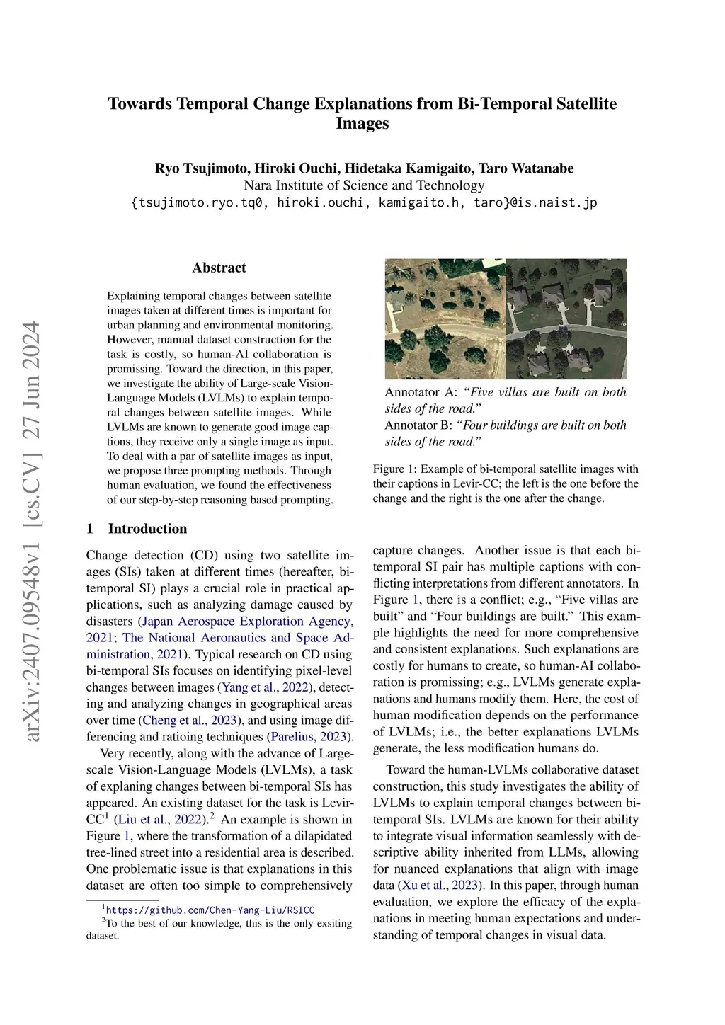 Explaining temporal changes between satellite images taken at different times is important for urban planning and environmental monitoring. However, manual dataset construction for the task is costly, so human-AI collaboration is promissing. Toward the direction, in this paper, we investigate the ability of Large-scale Vision-Language Models (LVLMs) to explain temporal changes between satellite images. While LVLMs are known to generate good image captions, they receive only a single image as input. To deal with a par of satellite images as input, we propose three prompting methods. Through human evaluation, we found the effectiveness of our step-by-step reasoning based prompting.