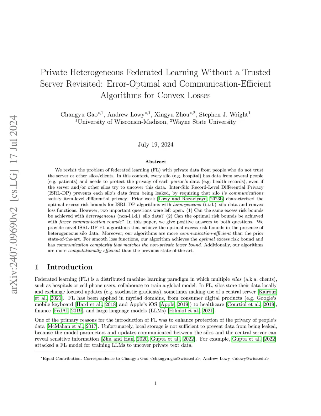 We revisit the problem of federated learning (FL) with private data from people who do not trust the server or other silos/clients. In this context, every silo (e.g. hospital) has data from several people (e.g. patients) and needs to protect the privacy of each person's data (e.g. health records), even if the server and/or other silos try to uncover this data. Inter-Silo Record-Level Differential Privacy (ISRL-DP) prevents each silo's data from being leaked, by requiring that silo i's communications satisfy item-level differential privacy. Prior work arXiv:2106.09779 characterized the optimal excess risk bounds for ISRL-DP algorithms with homogeneous (i.i.d.) silo data and convex loss functions. However, two important questions were left open: (1) Can the same excess risk bounds be achieved with heterogeneous (non-i.i.d.) silo data? (2) Can the optimal risk bounds be achieved with fewer communication rounds? In this paper, we give positive answers to both questions. We provide novel ISRL-DP FL algorithms that achieve the optimal excess risk bounds in the presence of heterogeneous silo data. Moreover, our algorithms are more communication-efficient than the prior state-of-the-art. For smooth loss functions, our algorithm achieves the optimal excess risk bound and has communication complexity that matches the non-private lower bound. Additionally, our algorithms are more computationally efficient than the previous state-of-the-art.