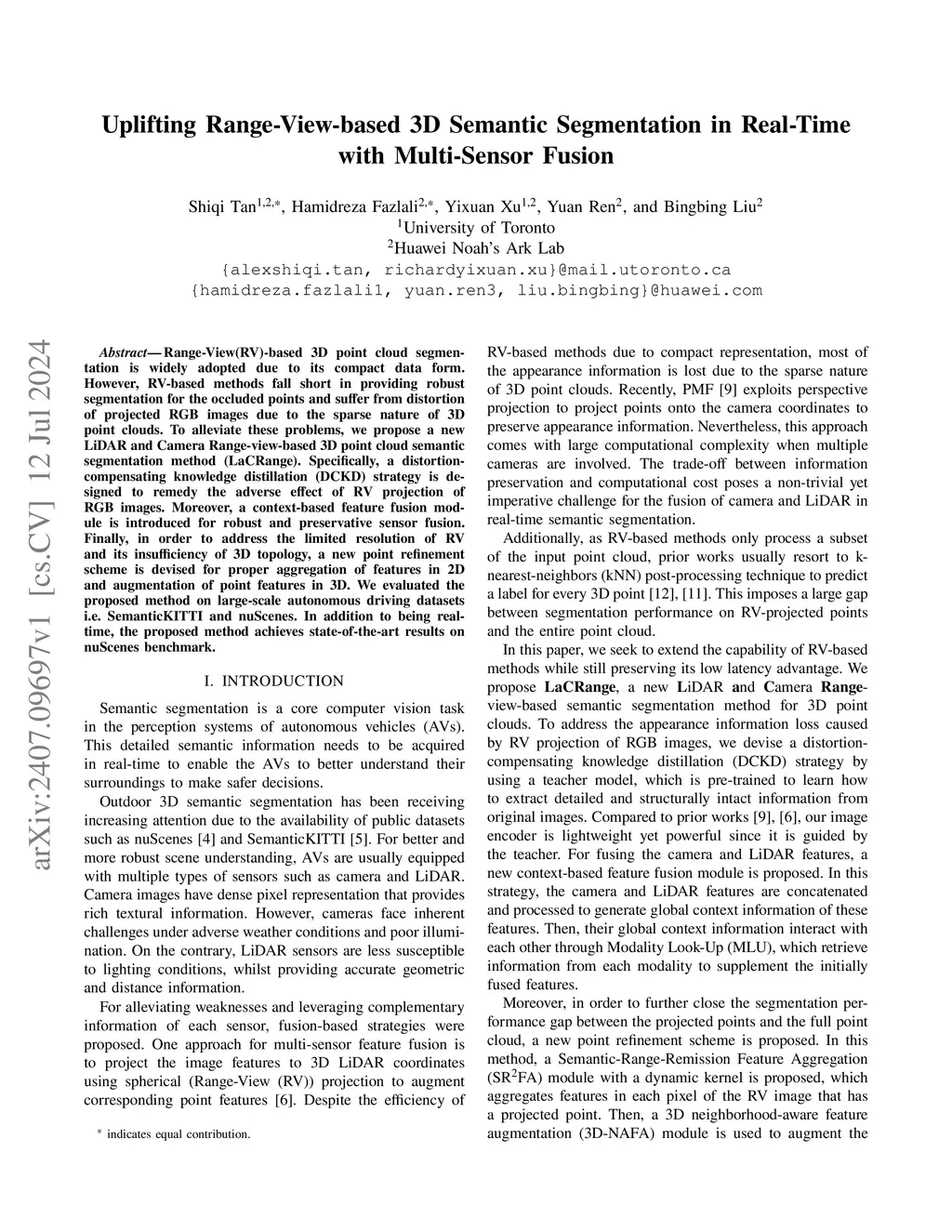 Range-View(RV)-based 3D point cloud segmentation is widely adopted due to its compact data form. However, RV-based methods fall short in providing robust segmentation for the occluded points and suffer from distortion of projected RGB images due to the sparse nature of 3D point clouds. To alleviate these problems, we propose a new LiDAR and Camera Range-view-based 3D point cloud semantic segmentation method (LaCRange). Specifically, a distortion-compensating knowledge distillation (DCKD) strategy is designed to remedy the adverse effect of RV projection of RGB images. Moreover, a context-based feature fusion module is introduced for robust and preservative sensor fusion. Finally, in order to address the limited resolution of RV and its insufficiency of 3D topology, a new point refinement scheme is devised for proper aggregation of features in 2D and augmentation of point features in 3D. We evaluated the proposed method on large-scale autonomous driving datasets \ie SemanticKITTI and nuScenes. In addition to being real-time, the proposed method achieves state-of-the-art results on nuScenes benchmark