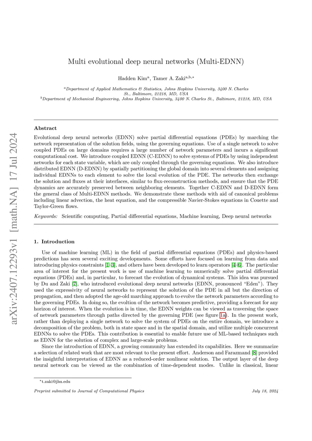 Evolutional deep neural networks (EDNN) solve partial differential equations (PDEs) by marching the network representation of the solution fields, using the governing equations. Use of a single network to solve coupled PDEs on large domains requires a large number of network parameters and incurs a significant computational cost. We introduce coupled EDNN (C-EDNN) to solve systems of PDEs by using independent networks for each state variable, which are only coupled through the governing equations. We also introduce distributed EDNN (D-EDNN) by spatially partitioning the global domain into several elements and assigning individual EDNNs to each element to solve the local evolution of the PDE. The networks then exchange the solution and fluxes at their interfaces, similar to flux-reconstruction methods, and ensure that the PDE dynamics are accurately preserved between neighboring elements. Together C-EDNN and D-EDNN form the general class of Multi-EDNN methods. We demonstrate these methods with aid of canonical problems including linear advection, the heat equation, and the compressible Navier-Stokes equations in Couette and Taylor-Green flows.