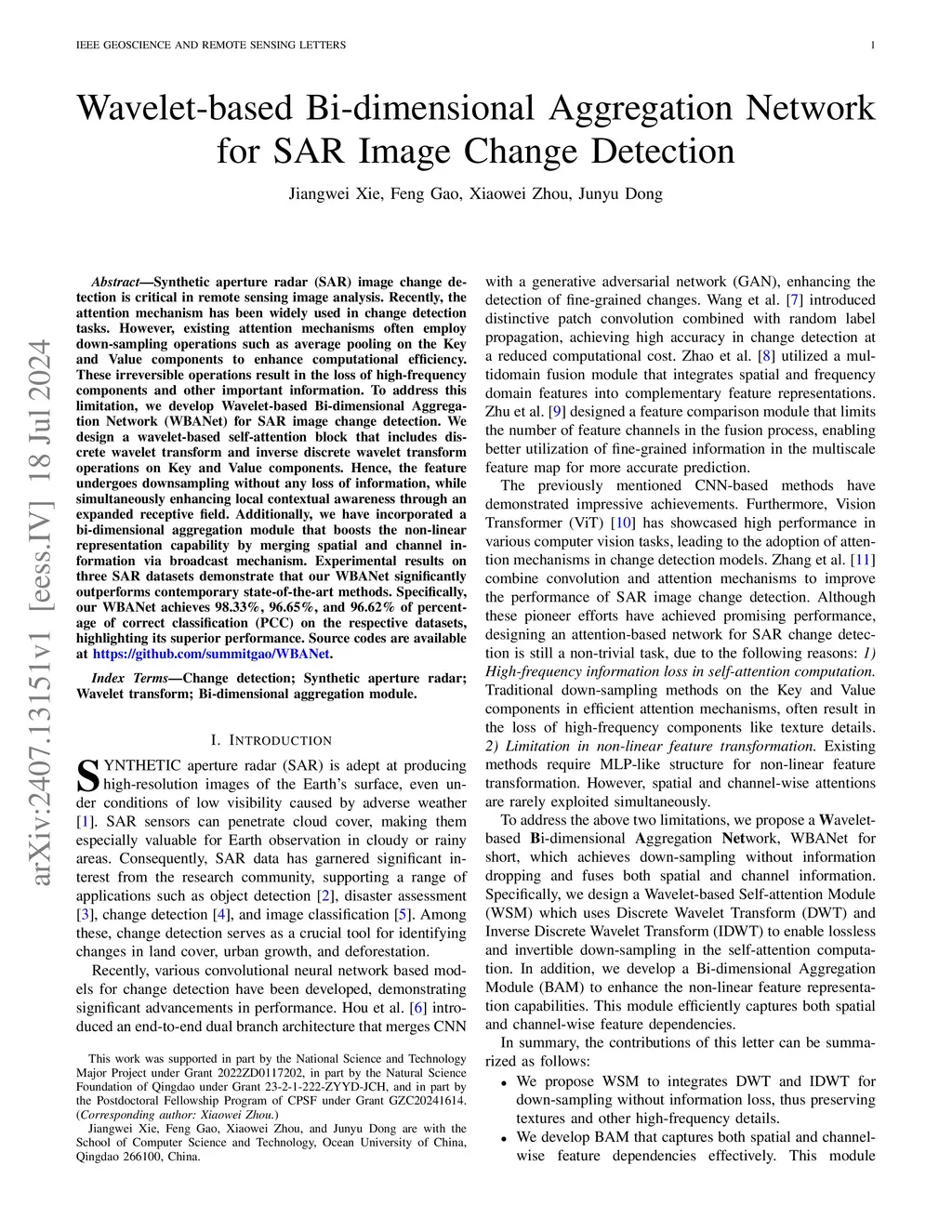 Synthetic aperture radar (SAR) image change detection is critical in remote sensing image analysis. Recently, the attention mechanism has been widely used in change detection tasks. However, existing attention mechanisms often employ down-sampling operations such as average pooling on the Key and Value components to enhance computational efficiency. These irreversible operations result in the loss of high-frequency components and other important information. To address this limitation, we develop Wavelet-based Bi-dimensional Aggregation Network (WBANet) for SAR image change detection. We design a wavelet-based self-attention block that includes discrete wavelet transform and inverse discrete wavelet transform operations on Key and Value components. Hence, the feature undergoes downsampling without any loss of information, while simultaneously enhancing local contextual awareness through an expanded receptive field. Additionally, we have incorporated a bi-dimensional aggregation module that boosts the non-linear representation capability by merging spatial and channel information via broadcast mechanism. Experimental results on three SAR datasets demonstrate that our WBANet significantly outperforms contemporary state-of-the-art methods. Specifically, our WBANet achieves 98.33\%, 96.65\%, and 96.62\% of percentage of correct classification (PCC) on the respective datasets, highlighting its superior performance. Source codes are available at \url{https://github.com/summitgao/WBANet}.
