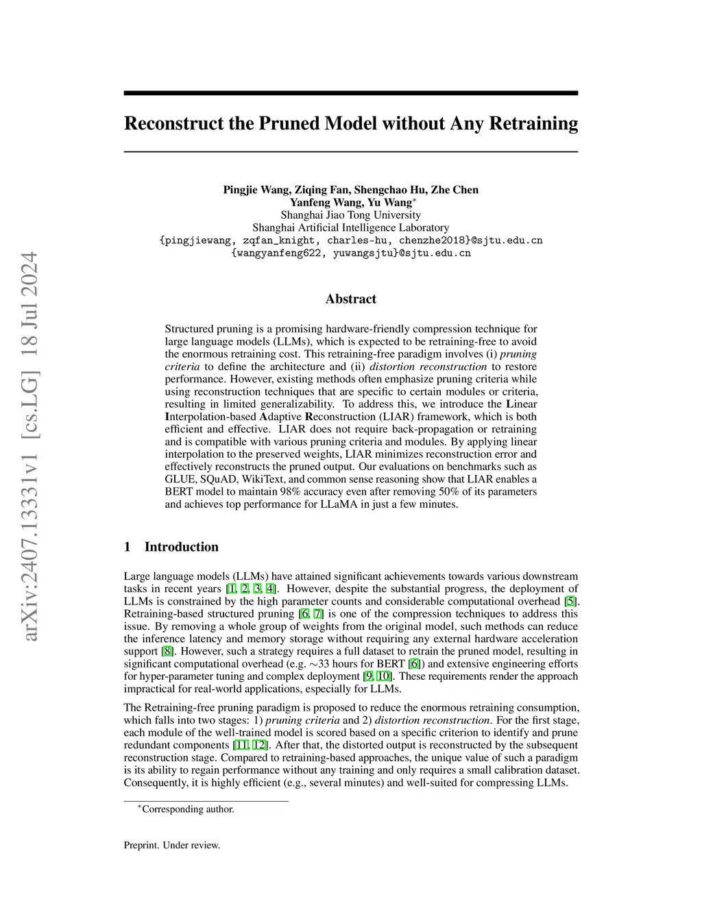 Structured pruning is a promising hardware-friendly compression technique for large language models (LLMs), which is expected to be retraining-free to avoid the enormous retraining cost. This retraining-free paradigm involves (1) pruning criteria to define the architecture and (2) distortion reconstruction to restore performance. However, existing methods often emphasize pruning criteria while using reconstruction techniques that are specific to certain modules or criteria, resulting in limited generalizability. To address this, we introduce the Linear Interpolation-based Adaptive Reconstruction (LIAR) framework, which is both efficient and effective. LIAR does not require back-propagation or retraining and is compatible with various pruning criteria and modules. By applying linear interpolation to the preserved weights, LIAR minimizes reconstruction error and effectively reconstructs the pruned output. Our evaluations on benchmarks such as GLUE, SQuAD, WikiText, and common sense reasoning show that LIAR enables a BERT model to maintain 98% accuracy even after removing 50% of its parameters and achieves top performance for LLaMA in just a few minutes.