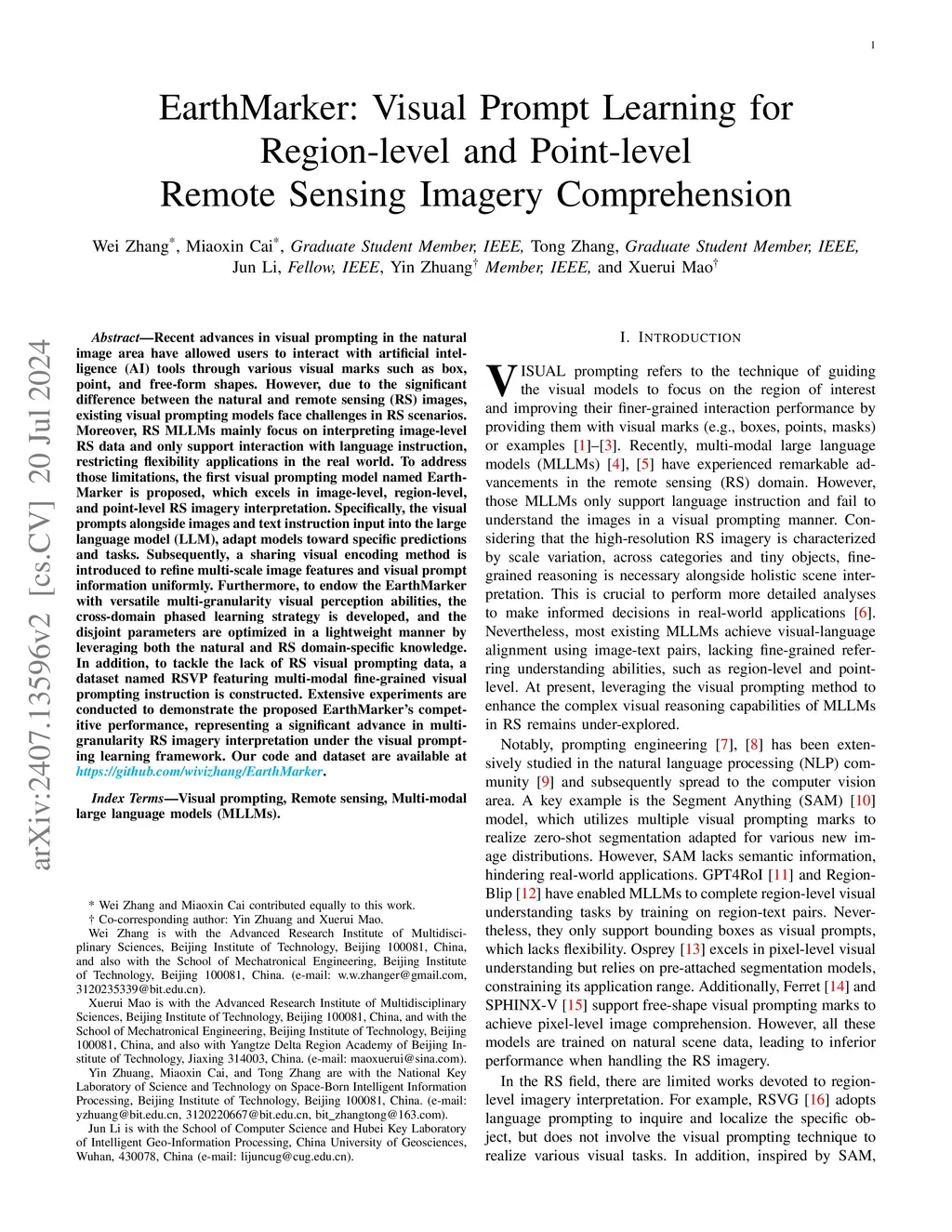 Recent advances in visual prompting in the natural image area have allowed users to interact with artificial intelligence (AI) tools through various visual marks such as box, point, and free-form shapes. However, due to the significant difference between the natural and remote sensing (RS) images, existing visual prompting models face challenges in RS scenarios. Moreover, RS MLLMs mainly focus on interpreting image-level RS data and only support interaction with language instruction, restricting flexibility applications in the real world. To address those limitations, the first visual prompting model named EarthMarker is proposed, which excels in image-level, region-level, and point-level RS imagery interpretation. Specifically, the visual prompts alongside images and text instruction input into the large language model (LLM), adapt models toward specific predictions and tasks. Subsequently, a sharing visual encoding method is introduced to refine multi-scale image features and visual prompt information uniformly. Furthermore, to endow the EarthMarker with versatile multi-granularity visual perception abilities, the cross-domain phased learning strategy is developed, and the disjoint parameters are optimized in a lightweight manner by leveraging both the natural and RS domain-specific knowledge. In addition, to tackle the lack of RS visual prompting data, a dataset named RSVP featuring multi-modal fine-grained visual prompting instruction is constructed. Extensive experiments are conducted to demonstrate the proposed EarthMarker's competitive performance, representing a significant advance in multi-granularity RS imagery interpretation under the visual prompting learning framework.
