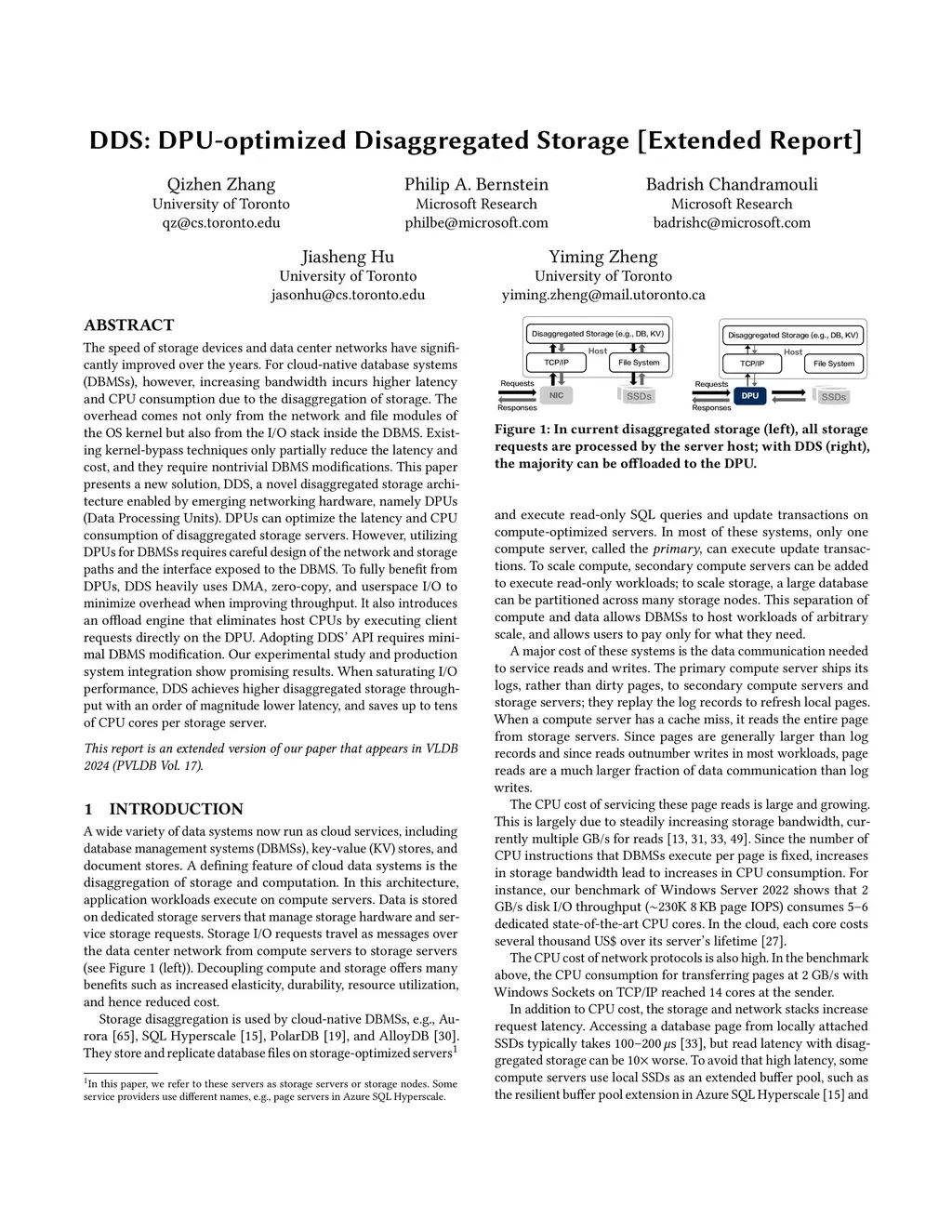 This extended report presents DDS, a novel disaggregated storage architecture enabled by emerging networking hardware, namely DPUs (Data Processing Units). DPUs can optimize the latency and CPU consumption of disaggregated storage servers. However, utilizing DPUs for DBMSs requires careful design of the network and storage paths and the interface exposed to the DBMS. To fully benefit from DPUs, DDS heavily uses DMA, zero-copy, and userspace I/O to minimize overhead when improving throughput. It also introduces an offload engine that eliminates host CPUs by executing client requests directly on the DPU. Adopting DDS' API requires minimal DBMS modification. Our experimental study and production system integration show promising results -- DDS achieves higher disaggregated storage throughput with an order of magnitude lower latency, and saves up to tens of CPU cores per storage server.