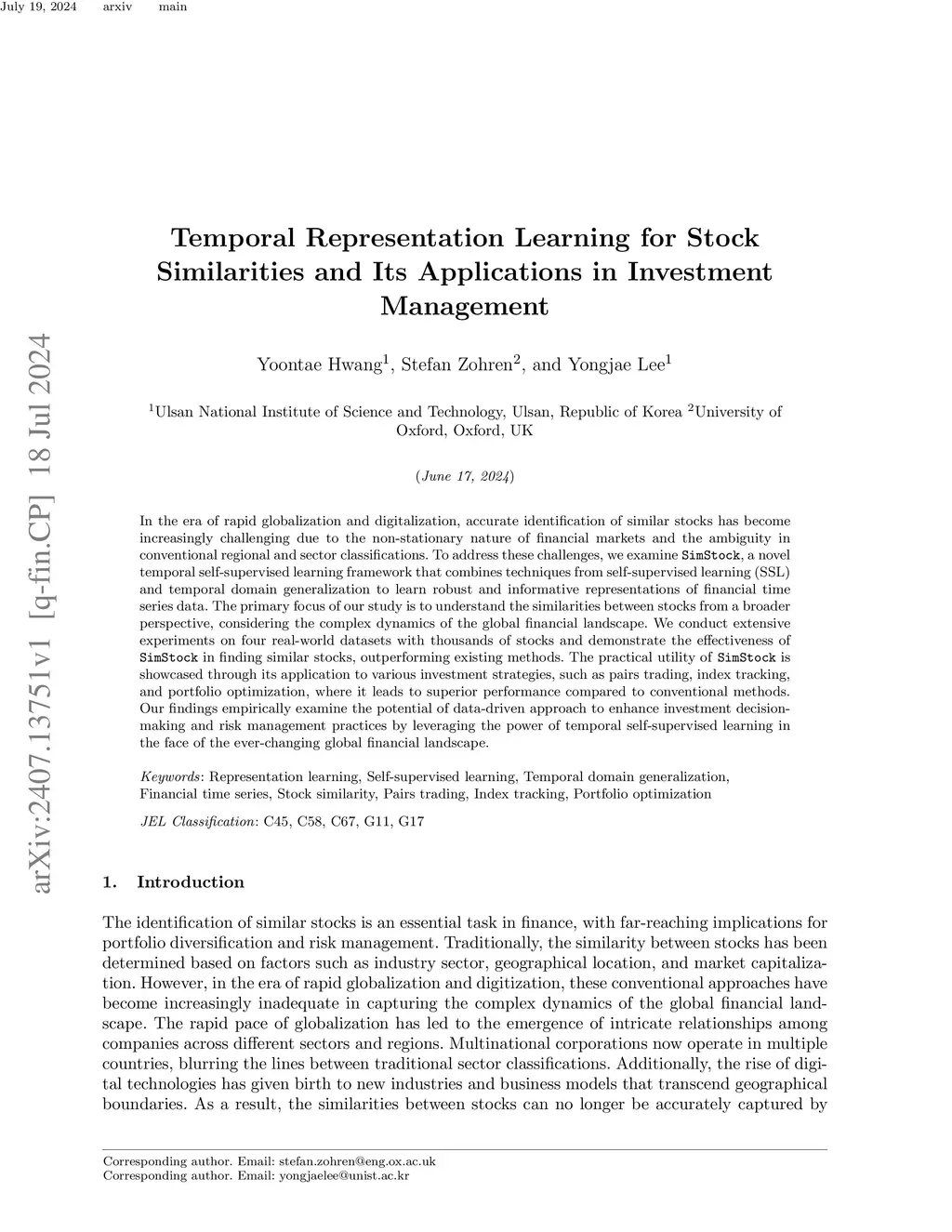 In the era of rapid globalization and digitalization, accurate identification of similar stocks has become increasingly challenging due to the non-stationary nature of financial markets and the ambiguity in conventional regional and sector classifications. To address these challenges, we examine SimStock, a novel temporal self-supervised learning framework that combines techniques from self-supervised learning (SSL) and temporal domain generalization to learn robust and informative representations of financial time series data. The primary focus of our study is to understand the similarities between stocks from a broader perspective, considering the complex dynamics of the global financial landscape. We conduct extensive experiments on four real-world datasets with thousands of stocks and demonstrate the effectiveness of SimStock in finding similar stocks, outperforming existing methods. The practical utility of SimStock is showcased through its application to various investment strategies, such as pairs trading, index tracking, and portfolio optimization, where it leads to superior performance compared to conventional methods. Our findings empirically examine the potential of data-driven approach to enhance investment decision-making and risk management practices by leveraging the power of temporal self-supervised learning in the face of the ever-changing global financial landscape.