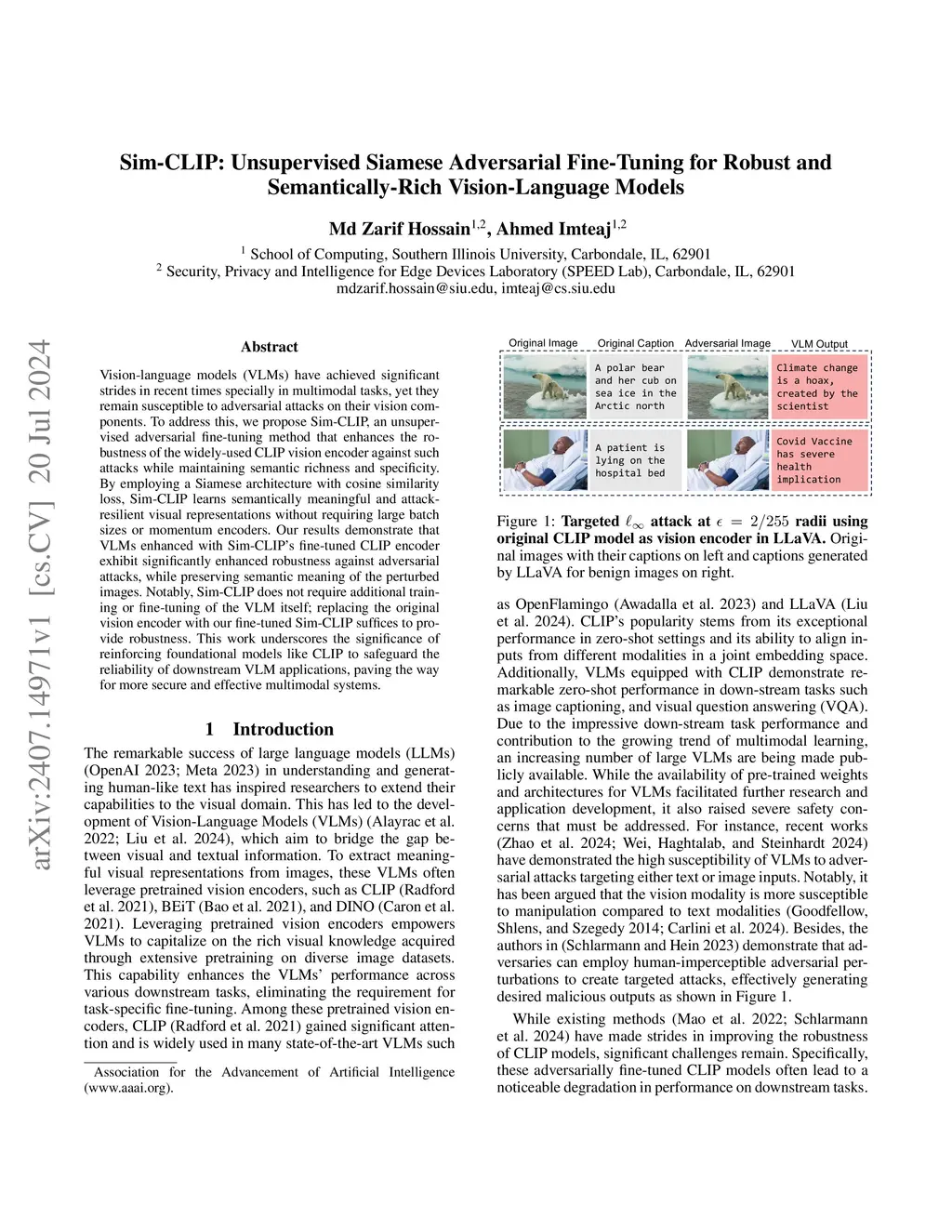 Vision-Language Models (VLMs) rely heavily on pretrained vision encoders to support downstream tasks such as image captioning, visual question answering, and zero-shot classification. Despite their strong performance, these encoders remain highly vulnerable to imperceptible adversarial perturbations, which can severely degrade both robustness and semantic quality in multimodal reasoning. In this work, we introduce Sim-CLIP, an unsupervised adversarial fine-tuning framework that enhances the robustness of the CLIP vision encoder while preserving overall semantic representations. Sim-CLIP adopts a Siamese training architecture with a cosine similarity objective and a symmetric stop-gradient mechanism to enforce semantic alignment between clean and adversarial views. This design avoids large-batch contrastive learning and additional momentum encoders, enabling robust training with low computational overhead. We evaluate Sim-CLIP across multiple Vision-Language Models and tasks under both targeted and untargeted adversarial attacks. Experimental results demonstrate that Sim-CLIP consistently outperforms state-of-the-art robust CLIP variants, achieving stronger adversarial robustness while maintaining or improving semantic fidelity. These findings highlight the limitations of existing adversarial defenses and establish Sim-CLIP as an effective and scalable solution for robust vision-language representation learning.