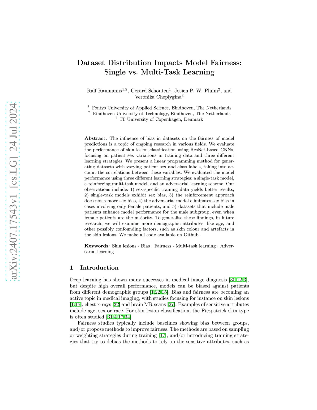 The influence of bias in datasets on the fairness of model predictions is a topic of ongoing research in various fields. We evaluate the performance of skin lesion classification using ResNet-based CNNs, focusing on patient sex variations in training data and three different learning strategies. We present a linear programming method for generating datasets with varying patient sex and class labels, taking into account the correlations between these variables. We evaluated the model performance using three different learning strategies: a single-task model, a reinforcing multi-task model, and an adversarial learning scheme. Our observations include: 1) sex-specific training data yields better results, 2) single-task models exhibit sex bias, 3) the reinforcement approach does not remove sex bias, 4) the adversarial model eliminates sex bias in cases involving only female patients, and 5) datasets that include male patients enhance model performance for the male subgroup, even when female patients are the majority. To generalise these findings, in future research, we will examine more demographic attributes, like age, and other possibly confounding factors, such as skin colour and artefacts in the skin lesions. We make all data and models available on GitHub.