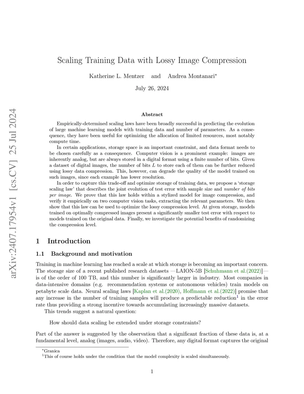 Empirically-determined scaling laws have been broadly successful in predicting the evolution of large machine learning models with training data and number of parameters. As a consequence, they have been useful for optimizing the allocation of limited resources, most notably compute time. In certain applications, storage space is an important constraint, and data format needs to be chosen carefully as a consequence. Computer vision is a prominent example: images are inherently analog, but are always stored in a digital format using a finite number of bits. Given a dataset of digital images, the number of bits to store each of them can be further reduced using lossy data compression. This, however, can degrade the quality of the model trained on such images, since each example has lower resolution. In order to capture this trade-off and optimize storage of training data, we propose a `storage scaling law' that describes the joint evolution of test error with sample size and number of bits per image. We prove that this law holds within a stylized model for image compression, and verify it empirically on two computer vision tasks, extracting the relevant parameters. We then show that this law can be used to optimize the lossy compression level. At given storage, models trained on optimally compressed images present a significantly smaller test error with respect to models trained on the original data. Finally, we investigate the potential benefits of randomizing the compression level.