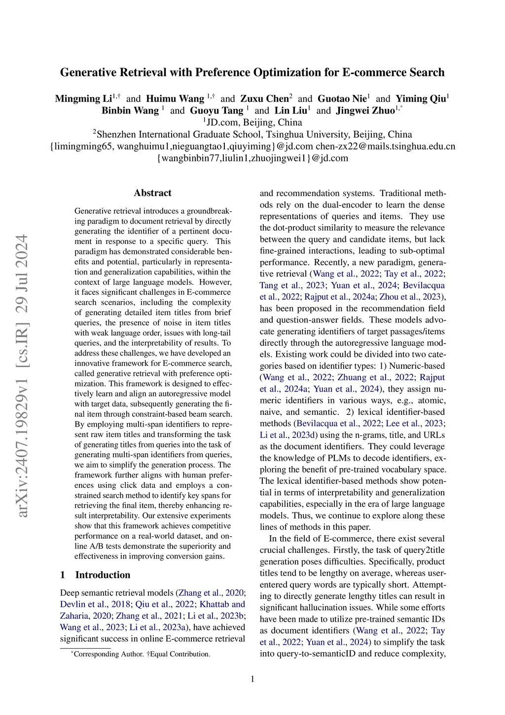 Generative retrieval introduces a groundbreaking paradigm to document retrieval by directly generating the identifier of a pertinent document in response to a specific query. This paradigm has demonstrated considerable benefits and potential, particularly in representation and generalization capabilities, within the context of large language models. However, it faces significant challenges in E-commerce search scenarios, including the complexity of generating detailed item titles from brief queries, the presence of noise in item titles with weak language order, issues with long-tail queries, and the interpretability of results. To address these challenges, we have developed an innovative framework for E-commerce search, called generative retrieval with preference optimization. This framework is designed to effectively learn and align an autoregressive model with target data, subsequently generating the final item through constraint-based beam search. By employing multi-span identifiers to represent raw item titles and transforming the task of generating titles from queries into the task of generating multi-span identifiers from queries, we aim to simplify the generation process. The framework further aligns with human preferences using click data and employs a constrained search method to identify key spans for retrieving the final item, thereby enhancing result interpretability. Our extensive experiments show that this framework achieves competitive performance on a real-world dataset, and online A/B tests demonstrate the superiority and effectiveness in improving conversion gains.