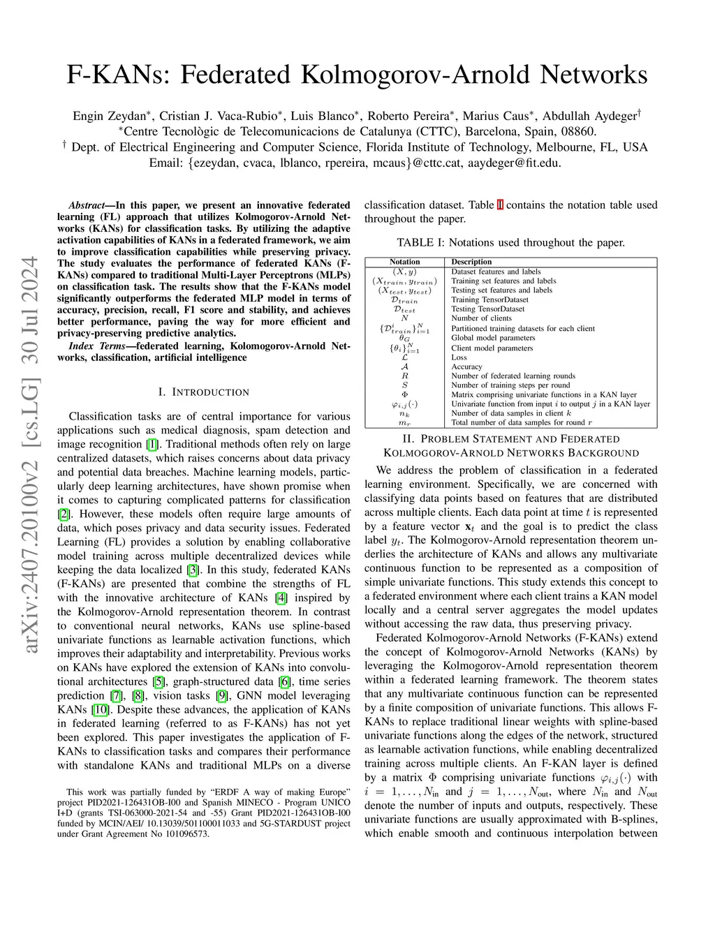 In this paper, we present an innovative federated learning (FL) approach that utilizes Kolmogorov-Arnold Networks (KANs) for classification tasks. By utilizing the adaptive activation capabilities of KANs in a federated framework, we aim to improve classification capabilities while preserving privacy. The study evaluates the performance of federated KANs (F- KANs) compared to traditional Multi-Layer Perceptrons (MLPs) on classification task. The results show that the F-KANs model significantly outperforms the federated MLP model in terms of accuracy, precision, recall, F1 score and stability, and achieves better performance, paving the way for more efficient and privacy-preserving predictive analytics.