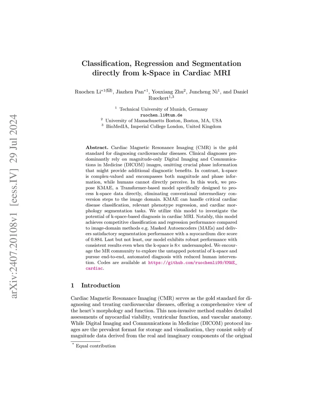 Cardiac Magnetic Resonance Imaging (CMR) is the gold standard for diagnosing cardiovascular diseases. Clinical diagnoses predominantly rely on magnitude-only Digital Imaging and Communications in Medicine (DICOM) images, omitting crucial phase information that might provide additional diagnostic benefits. In contrast, k-space is complex-valued and encompasses both magnitude and phase information, while humans cannot directly perceive. In this work, we propose KMAE, a Transformer-based model specifically designed to process k-space data directly, eliminating conventional intermediary conversion steps to the image domain. KMAE can handle critical cardiac disease classification, relevant phenotype regression, and cardiac morphology segmentation tasks. We utilize this model to investigate the potential of k-space-based diagnosis in cardiac MRI. Notably, this model achieves competitive classification and regression performance compared to image-domain methods e.g. Masked Autoencoders (MAEs) and delivers satisfactory segmentation performance with a myocardium dice score of 0.884. Last but not least, our model exhibits robust performance with consistent results even when the k-space is 8* undersampled. We encourage the MR community to explore the untapped potential of k-space and pursue end-to-end, automated diagnosis with reduced human intervention.