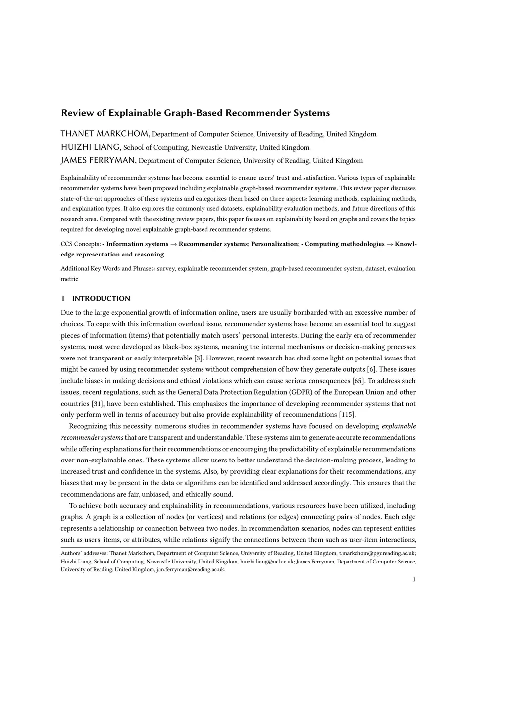 Explainability of recommender systems has become essential to ensure users' trust and satisfaction. Various types of explainable recommender systems have been proposed including explainable graph-based recommender systems. This review paper discusses state-of-the-art approaches of these systems and categorizes them based on three aspects: learning methods, explaining methods, and explanation types. It also explores the commonly used datasets, explainability evaluation methods, and future directions of this research area. Compared with the existing review papers, this paper focuses on explainability based on graphs and covers the topics required for developing novel explainable graph-based recommender systems.