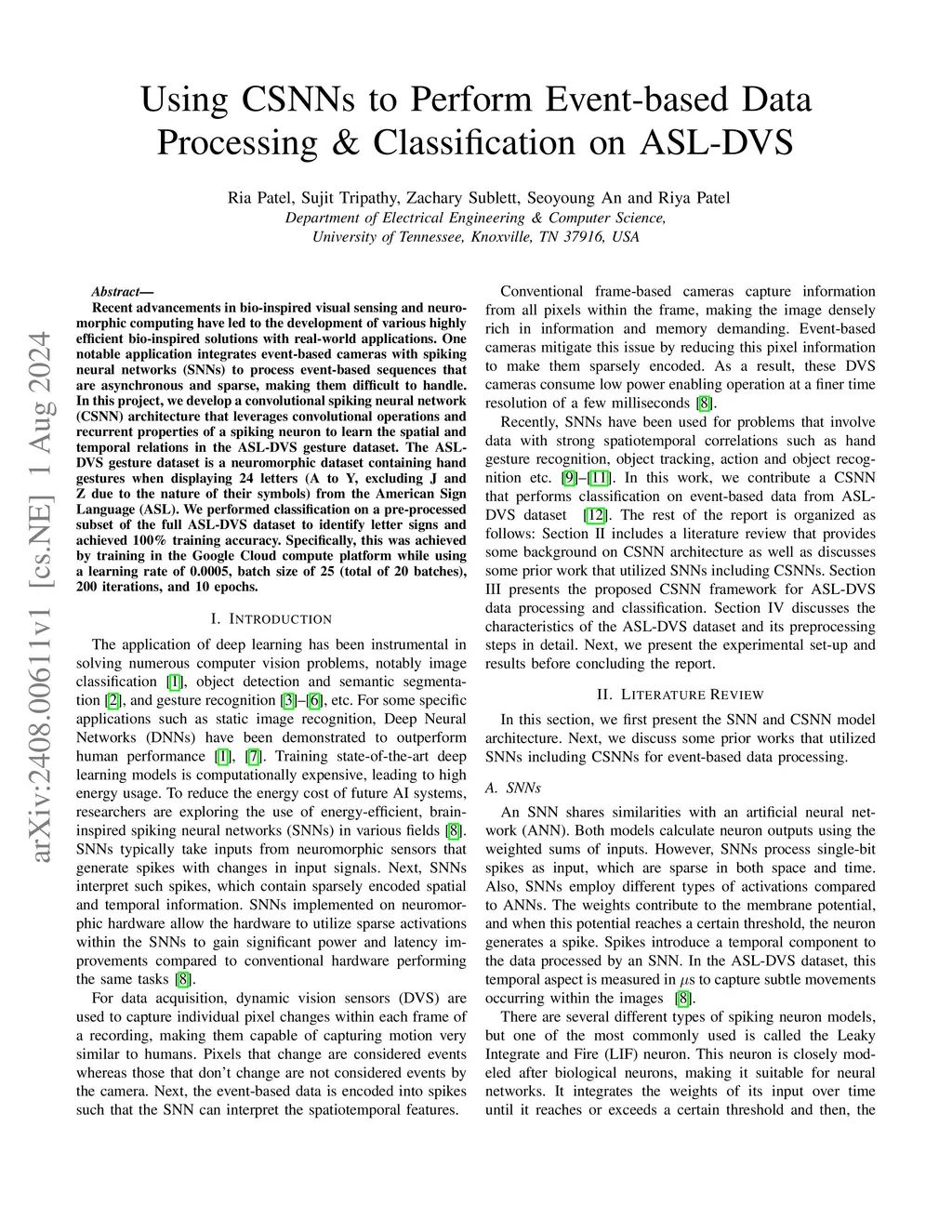Recent advancements in bio-inspired visual sensing and neuromorphic computing have led to the development of various highly efficient bio-inspired solutions with real-world applications. One notable application integrates event-based cameras with spiking neural networks (SNNs) to process event-based sequences that are asynchronous and sparse, making them difficult to handle. In this project, we develop a convolutional spiking neural network (CSNN) architecture that leverages convolutional operations and recurrent properties of a spiking neuron to learn the spatial and temporal relations in the ASL-DVS gesture dataset. The ASL-DVS gesture dataset is a neuromorphic dataset containing hand gestures when displaying 24 letters (A to Y, excluding J and Z due to the nature of their symbols) from the American Sign Language (ASL). We performed classification on a pre-processed subset of the full ASL-DVS dataset to identify letter signs and achieved 100\% training accuracy. Specifically, this was achieved by training in the Google Cloud compute platform while using a learning rate of 0.0005, batch size of 25 (total of 20 batches), 200 iterations, and 10 epochs.