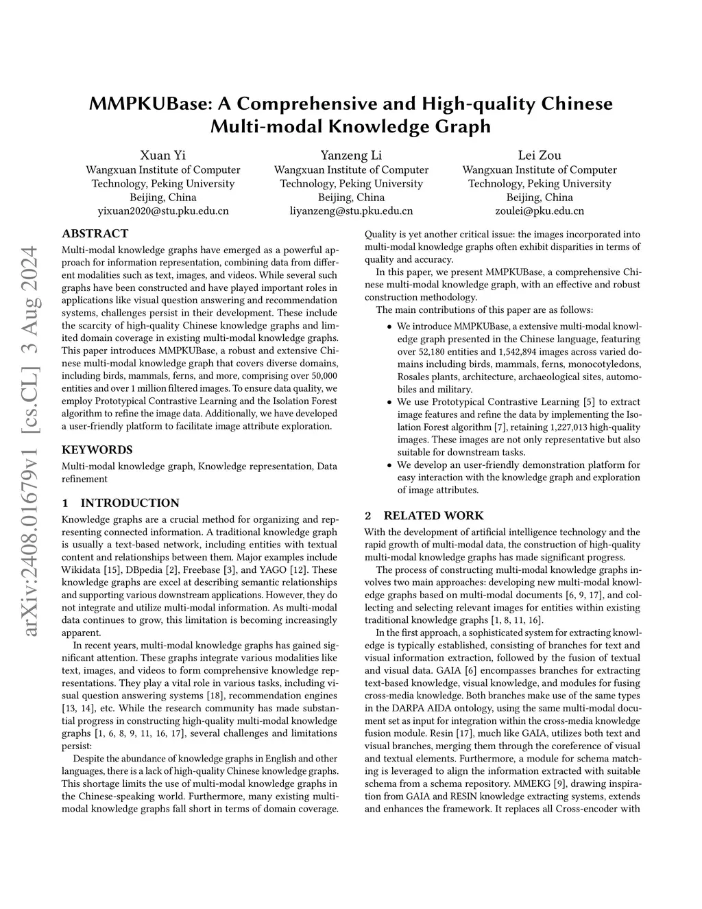 Multi-modal knowledge graphs have emerged as a powerful approach for information representation, combining data from different modalities such as text, images, and videos. While several such graphs have been constructed and have played important roles in applications like visual question answering and recommendation systems, challenges persist in their development. These include the scarcity of high-quality Chinese knowledge graphs and limited domain coverage in existing multi-modal knowledge graphs. This paper introduces MMPKUBase, a robust and extensive Chinese multi-modal knowledge graph that covers diverse domains, including birds, mammals, ferns, and more, comprising over 50,000 entities and over 1 million filtered images. To ensure data quality, we employ Prototypical Contrastive Learning and the Isolation Forest algorithm to refine the image data. Additionally, we have developed a user-friendly platform to facilitate image attribute exploration.