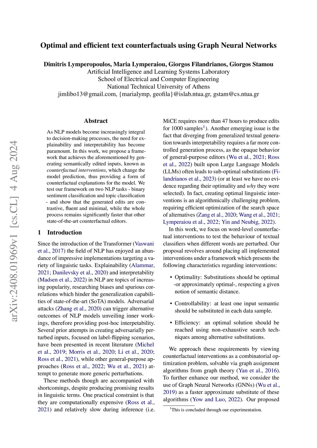 Optimal and efficient text counterfactuals using Graph Neural Networks