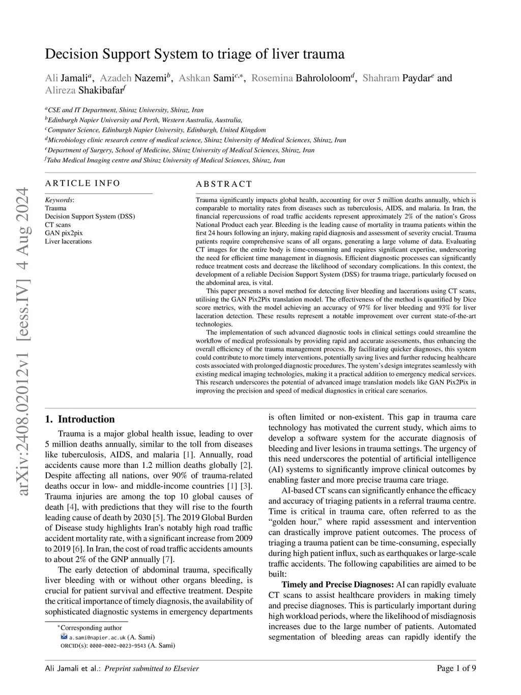 Trauma significantly impacts global health, accounting for over 5 million deaths annually, which is comparable to mortality rates from diseases such as tuberculosis, AIDS, and malaria. In Iran, the financial repercussions of road traffic accidents represent approximately 2% of the nation's Gross National Product each year. Bleeding is the leading cause of mortality in trauma patients within the first 24 hours following an injury, making rapid diagnosis and assessment of severity crucial. Trauma patients require comprehensive scans of all organs, generating a large volume of data. Evaluating CT images for the entire body is time-consuming and requires significant expertise, underscoring the need for efficient time management in diagnosis. Efficient diagnostic processes can significantly reduce treatment costs and decrease the likelihood of secondary complications. In this context, the development of a reliable Decision Support System (DSS) for trauma triage, particularly focused on the abdominal area, is vital. This paper presents a novel method for detecting liver bleeding and lacerations using CT scans, utilising the GAN Pix2Pix translation model. The effectiveness of the method is quantified by Dice score metrics, with the model achieving an accuracy of 97% for liver bleeding and 93% for liver laceration detection. These results represent a notable improvement over current state-of-the-art technologies. The system's design integrates seamlessly with existing medical imaging technologies, making it a practical addition to emergency medical services. This research underscores the potential of advanced image translation models like GAN Pix2Pix in improving the precision and speed of medical diagnostics in critical care scenarios.